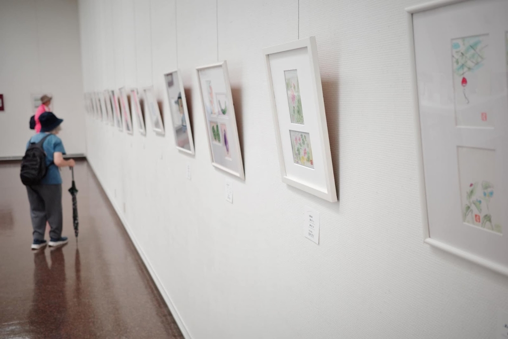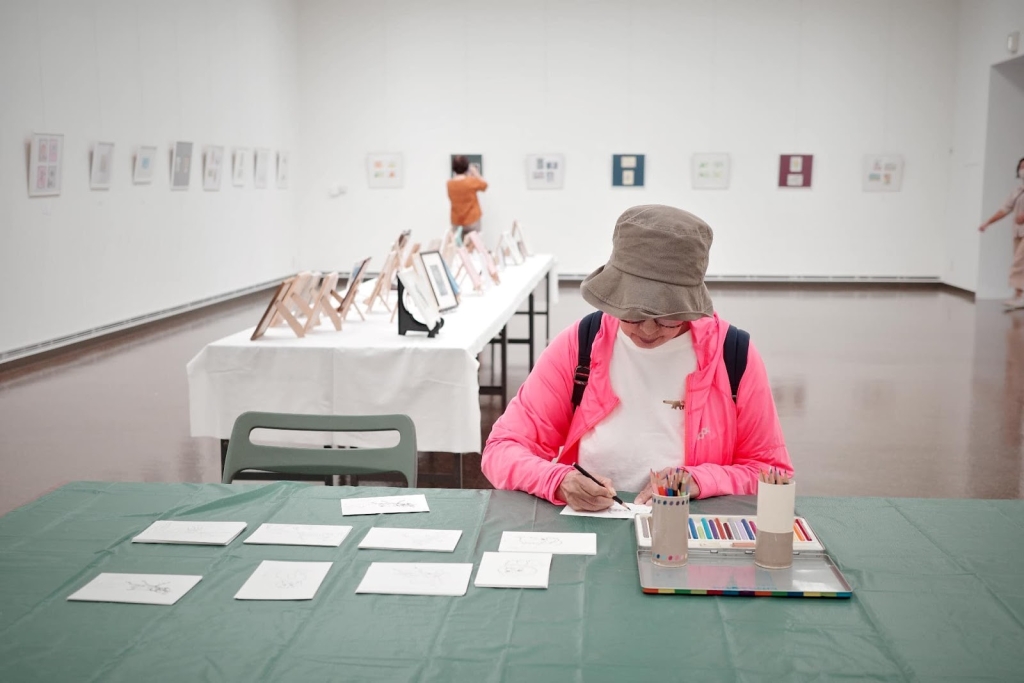 阿嬤在這些展場,看得十分有滋味。我們觀察到畫展裡,大家喜歡的主題,有動物、野菜、貓咪狗狗、佛像、地藏等速寫,又或是傳說故事四季花草。策展方也設計了一個讓參觀者做「繪之交流」的空間。