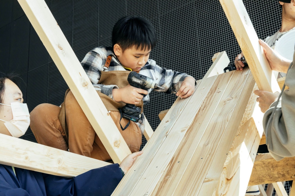 這屆的外掛學校,以「和孩子們一起一起」為核心精神,在美術館空間中臨時搭建一座遊戲場。設計與建造的主體不僅有藝術家、館員、社區長者,也包含了孩子們自己——這是一場試圖將「兒童自主」從理念實踐到空間行動的實驗。