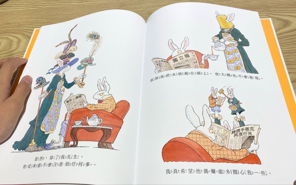 為了讓媽媽常保身心健康,我們都應該好好關心她,大家可以跟我一起讀讀《白兔夫人》,她寫在日記裡的除了對家人的種種關心和擔心,還有她自己不被家人在意的煩惱和憂愁,白兔先生在紅心皇后的宮殿裡任職,就是我們都耳熟能詳的《愛麗絲夢遊仙境》裡那個總是匆匆忙忙的白兔先生,因為公務繁忙,他對白兔夫人漠不關心,甚至還常會帶回神出鬼沒的柴郡貓和忽大忽小的人類小女孩,每天辛苦接招的白兔夫人只能把心事寫在日記裡,要不是她沒把日記放好,白兔先生可能永遠不會發現,我想我們的媽媽也和白兔夫人一樣需要被關心,需要聽她們說說話,大家不要去偷看媽媽的日記,好好去和媽媽聊聊,抱抱她吧!