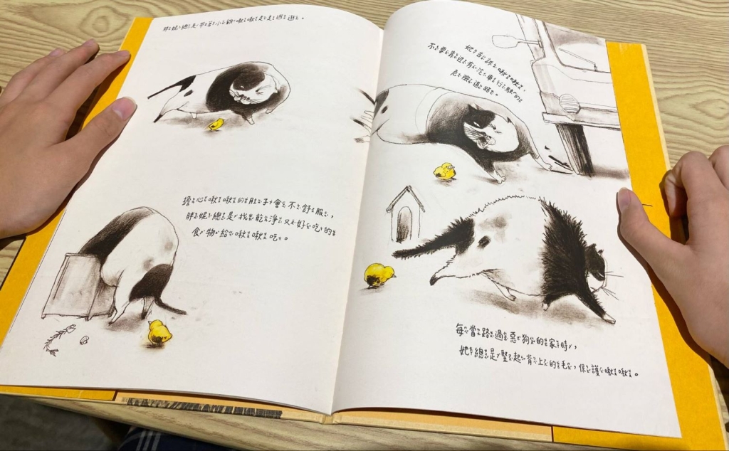 最後,我想要跟大家分享,我讀過長得最古怪的一位媽媽:《啾啾的媽媽》,是我很喜歡的韓國繪本作家白希那最新出版的作品,女主角胖妮,是一隻惡名昭彰的貓,貪吃又愛欺負弱小,和他在封面那邪惡的眼神一樣不討喜,有一天他吞了一顆偷來的蛋,竟然「懷孕」了,肚子越來越大,還生下了~一隻小雞,小雞鑽進了胖妮懷裡,也鑽進了他心裡,他給小雞取了「啾啾」的名字,悉心的愛護照顧啾啾,雖然胖妮還是胖妮,但是他眼神裡有了媽媽的溫柔,從此他成為了「啾啾的媽媽」,讓我看到了最後也覺得啾啾的媽媽胖妮變得好可愛呀! 雖然這幾本書裡的媽媽都不完美,但我們是不是都看見了她們可愛的地方?因為他們即使沒有十項全能,卻會努力愛護她的家人,即使不是從不發脾氣的溫柔天使,但是會把心底最柔軟的那個位置留給她的孩子,即使她們沒有仙女一樣的美貌,但因為她們這樣溫暖的愛,她永遠都會是小孩心目中最可愛的媽媽!