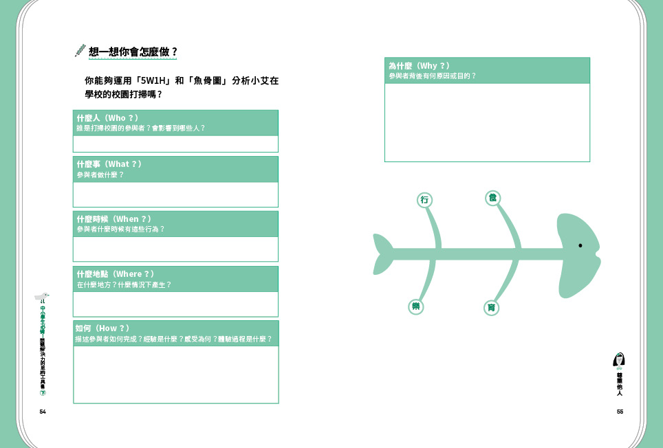 本書收錄實際的生活情境,透過邏輯思考脈絡以及思考工具,學習自我探索、關懷環境,以及情緒管理。以思考工具「5W1H」深入問題根源,「魚骨圖」查找問題多重原因,還有「AEIOU法」等。讓孩子養成系統思考,增進問題解決與創新應變的能力。