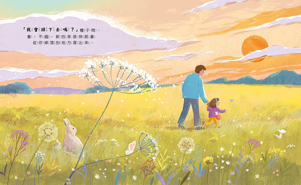 故事的文字結構很單純,就型式上來說,是一對父女間的對話,女孩重複的提問,帶出父親每一句都同樣穩定的回應;但除了表層的句型結構外,每句重複提問、每句穩定回應,都有其極重要的意義與價值。從女孩的提問可以看到她對世界的好奇心,畫面有他們手牽手的樣態,還有草原林間的動物們的出現,但她的好奇著眼在微小重要的觀察裡,像是種籽、落葉、影子、陽光……,而父親的回應,更象徵一種情緒的穩定力量,語句的正向眼光無時無刻都在影響著看待事物的思維。