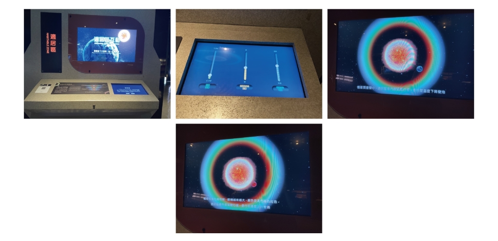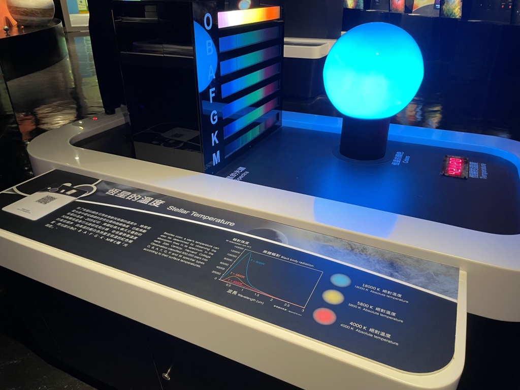 走到2樓「恆星的溫度」互動裝置,最先注意到的就是圓圓的球體,按下啟動鍵,旋轉溫度轉軸,就會發現,當恆星呈現漂亮的水藍色時,溫度最高,隨著顏色逐漸轉變為紅色,溫度也越來越低。原來透過觀測恆星的顏色,就可以推算表面溫度,因為每一種顏色都有相對應的波長和輻射強度,科學家於是以此來推測恆星的溫度。