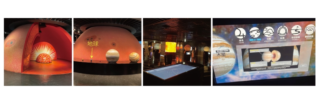才一轉身,就看到大大的太陽剖面,最裡面的「太陽核心」,是引發核融合反應的地方,是太陽的能量來源;形象光芒四射的中間區域,是輻射層;而最外層是「對流層」,從側面觀察,可以看見一圈一圈的循環方向,藉此呈現太陽表面的能量對流機制。太陽的旁邊圍繞著八大行星,對比之下,地球真的好小好小。慢慢走到位在樓梯另一邊的空間,透過隨附在每顆行星的螢幕,能夠獲得更多詳細資訊,包含行星的命名、外觀、結構、與地球的距離,以及超級有趣的體重變換。特別提醒一定要站在指定位置上喔~這樣才可以正確量測你在地球的體重,並且換算成在其他星球的重量!