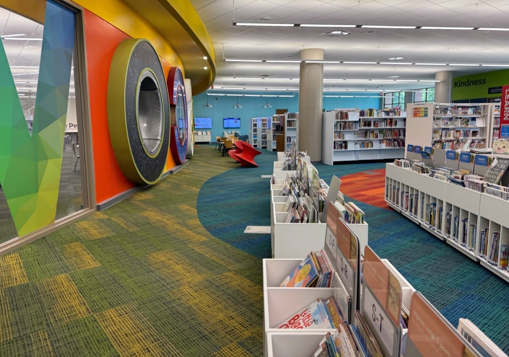 這棟圖書館融合現代設計與社區功能,為當地居民提供豐富的學習資源與活動空間。走進圖書館一樓,最吸睛的是以巨大立體字母拼成的「DISCOVER」牆,這是座能讓孩子爬進爬出的互動式公共藝術。每個字母都用不同的材質設計,有的是隧道,有的是書架,有的則是柔軟的閱讀座位,是吸引孩子進入書本世界的遊戲入口。