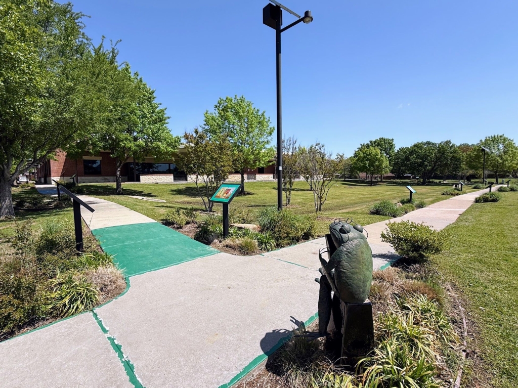 凱勒(Keller)是位於達拉斯–沃斯堡都會區西北郊的小城市,雖然地理上靠近大都市,但凱勒保有寧靜舒適的郊區氛圍,是許多家庭選擇定居的住宅型城市。車子開進凱勒公共圖書館的停車場,馬上就會注意到圖書館周圍腹地廣大,旁邊就有一座公園,有好玩的木造兒童遊戲場以及大片草坪。另外,圖書館後方的戶外空間也被充分利用,設有「故事步道(Tale Trail)」,沿步道設有 二十面展示牌,依序展出圖畫書的書頁,穿插藝術雕塑、壁畫與涼亭,讓孩子在走讀中沉浸於故事世界。