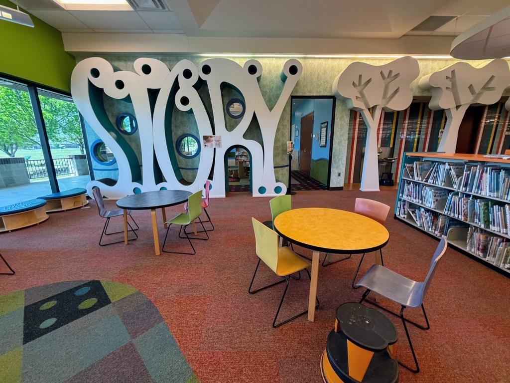 一走進圖書館,首先會注意到大廳中央的雕像,是一位女孩舒服的躲在圓形的空間裡閱讀。凱勒公共圖書館內部不大,只有一層樓,但是有二分之一的空間都是兒童和青少年圖書區。最特別的是兒童書區有樹木造型的立體大字「STORY」,既是裝飾也是小門和閱讀角落。這片文字樹林的背後,就是幼兒遊戲室,設有各式幼兒玩具、圖書,以及給父母的親職書籍。