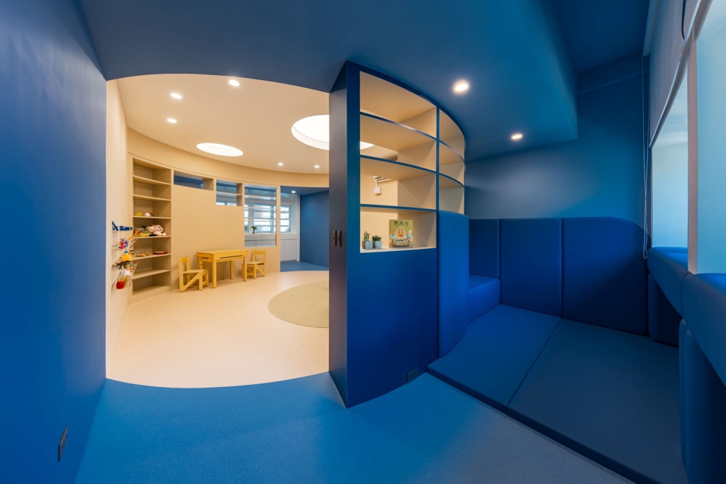 學生的心理健康日益受到關注,輔導空間成為校園支持系統的關鍵場域。臺北市新湖國小原先僅設有一間輔導諮商室,為提升服務品質,希望再改造兩間輔諮空間作為增援。時刻建築運用圓弧語彙及藍白柔和色系建構出安全、親和的情緒支持環境,並設置孩子能安心釋放壓力的冷靜區,以及符合低年級學童身高的沙遊區,實踐包容與照護的空間原則。