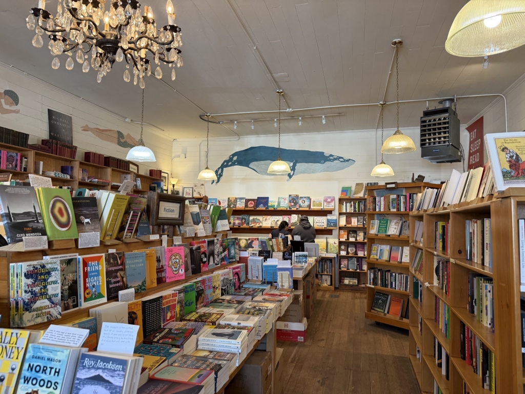 小鎮中心有間充滿海洋氣息的獨立書店 Point Reyes Books,創立於 2002 年,是當地居民與遊客都相當喜愛的文化空間。書店的空間佈置溫馨而富深度,木質書架與上放環繞的鯨魚、鵜鶘、泳者壁畫營造出貼近自然的閱讀氛圍。書店選書以自然文學、環境議題與人文社會為主軸,童書區則特別規劃於大灰鯨壁畫下方,涵蓋繪本、橋梁書、圖文小說,以及與動物、生態、地方文化有關的作品,展現書店對於孩子閱讀的重視,也與在地長期深耕的自然教育傳統相呼應。