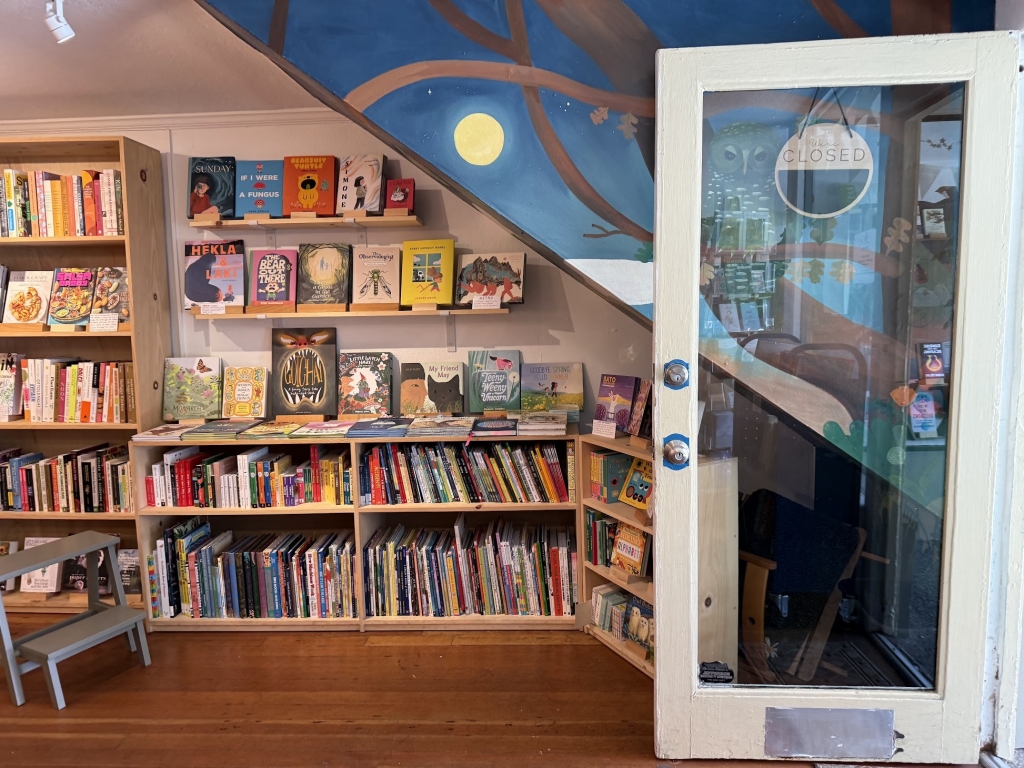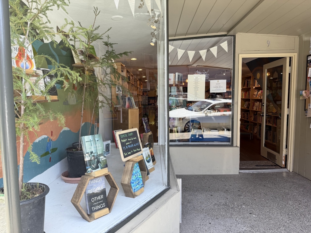 這裡有 Point Reyes Books 店主於 2023 年新開設的姊妹店 Wayfinder Bookshop。小書店雖然空間不大,卻延續同樣注重自然、人文與童書的選書精神。與雷斯岬書店的海洋風格不同,這間書店以山林為靈感設計,櫥窗裡有綠色系地圖壁畫、木質展示書架,還有真的紅木樹苗盆栽,童書角的壁畫則是貓頭鷹與靜謐的月夜山林。Fairfax 小鎮以音樂文化與登山腳踏車活動聞名,附近有腳踏車博物館與登山車名人堂,街區林立著咖啡館、獨立書店與各式餐廳,是馬林縣另一處值得停留與探索的所在。