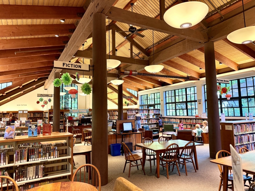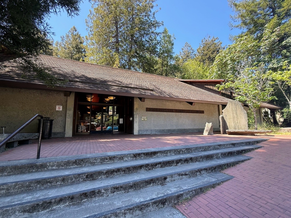 公共圖書館 Mill Valley Public Library 就位於老磨坊公園旁的山坡上,於 1966 年落成,設計時刻意保留場地原有的紅木與橡樹,讓建築融入地景,從街道正面望去,圖書館彷彿僅有一層樓,實則順著山勢向下延伸,共有三層空間。館內大量使用玻璃與木材,將森林光影與自然氣息引入室內,許多家具由在地木匠手工打造,木頭書桌、書架與扶手的質感摸起來溫潤舒適。主層為主閱覽室與面向紅木林的露台,壁爐前還有舒適的閱讀座位;館內還有青少年區、小說書庫、當地史料室、多功能活動室等。
