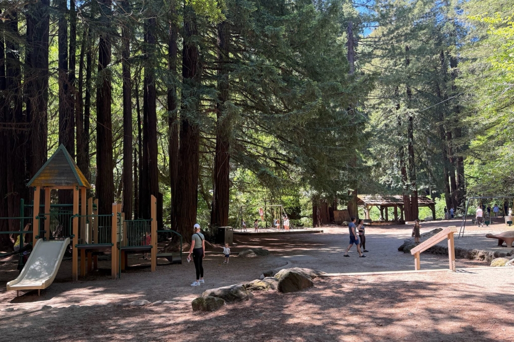 從圖書館後門即可踏上登山步道,知名的 Dipsea Trail是從山谷通往海岸的傳奇越野路線,起點就在圖書館後方。若想要輕鬆一些,鄰近的 Cascade Falls Trail 是更適合親子的森林健行路線,全長約三公里,沿溪而行,終點是一座可親水玩耍的小瀑布。不遠處的有繆爾紅木森林國家紀念公園(Muir Woods National Monument),保留了大片壯觀的紅木林,園內鋪設平坦的木板步道,很適合親子健行與探索。園區也提供小小公園管理員(Junior Ranger)活動,孩子完成手冊上的活動,可以獲得小管理員徽章,還可認識加州的紅木森林生態。