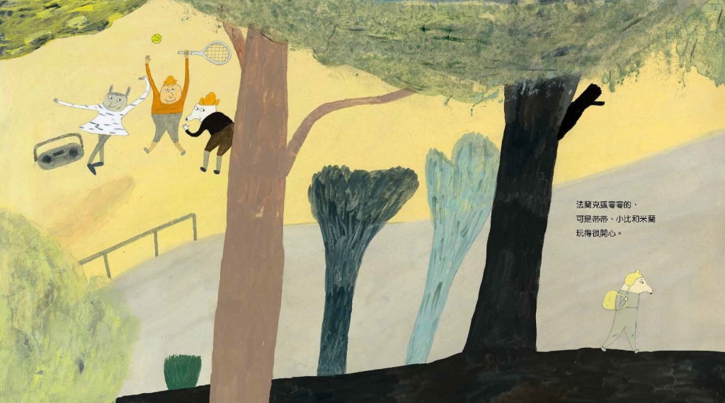 故事的文字由法蘭克的觀點描述,圖畫呈現的卻是全知觀點,文圖間存有矛盾,例如,當法蘭克認為大家都走開了,其他人卻是看著他的,因此,有可能是他自己走開了。之後,法蘭克從圍牆邊偷偷看著大家一起玩,而他們的眼睛也瞄著他,等到法蘭克往相反的方向離開時,大家一起停下來望他。到底這三個人是刻意孤立法蘭克,還是在等待法蘭克主動加入?林斯特留了空間,讓讀者從不同的角度自行體會。