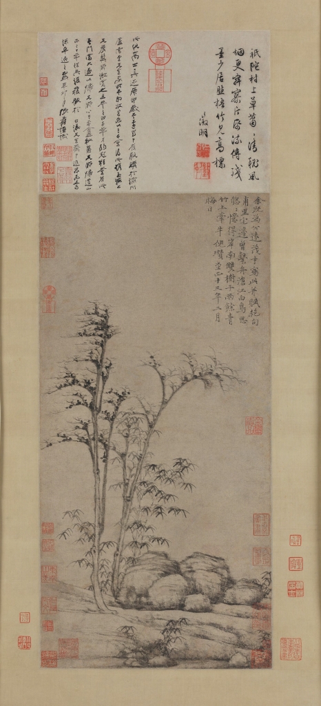 倪瓚生於江蘇太湖畔的無錫,自小家道殷實,詩書畫皆有所成,然因元末天災、戰亂頻仍,重稅逼人,倪瓚只得放棄家業,以船為家,漂泊於山水間。他曾在吳淞江邊靠岸,寄居甫里親戚家,和年輕的公遠結為知交。離開前,他為公遠畫了《岸南雙樹》圖,並題寫:「余既為公遠茂才寫此并賦絕句 甫里岸邊曾繫舟 滄江白鳥思悠悠 憶得岸南雙樹子 雨餘青竹上牽牛 倪瓚 至正十三年二月晦日」,那是西元1353年2月的最後一天。