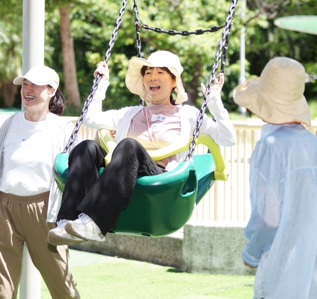 那天晴空萬里,熱極了,天母運動公園遊戲場熱氣奔騰,遊具也燒燙燙,原以為老師會因此意興闌珊,沒想到年齡橫跨二十至六十歲的老師群玩起來,瘋狂的程度,可比孩童。