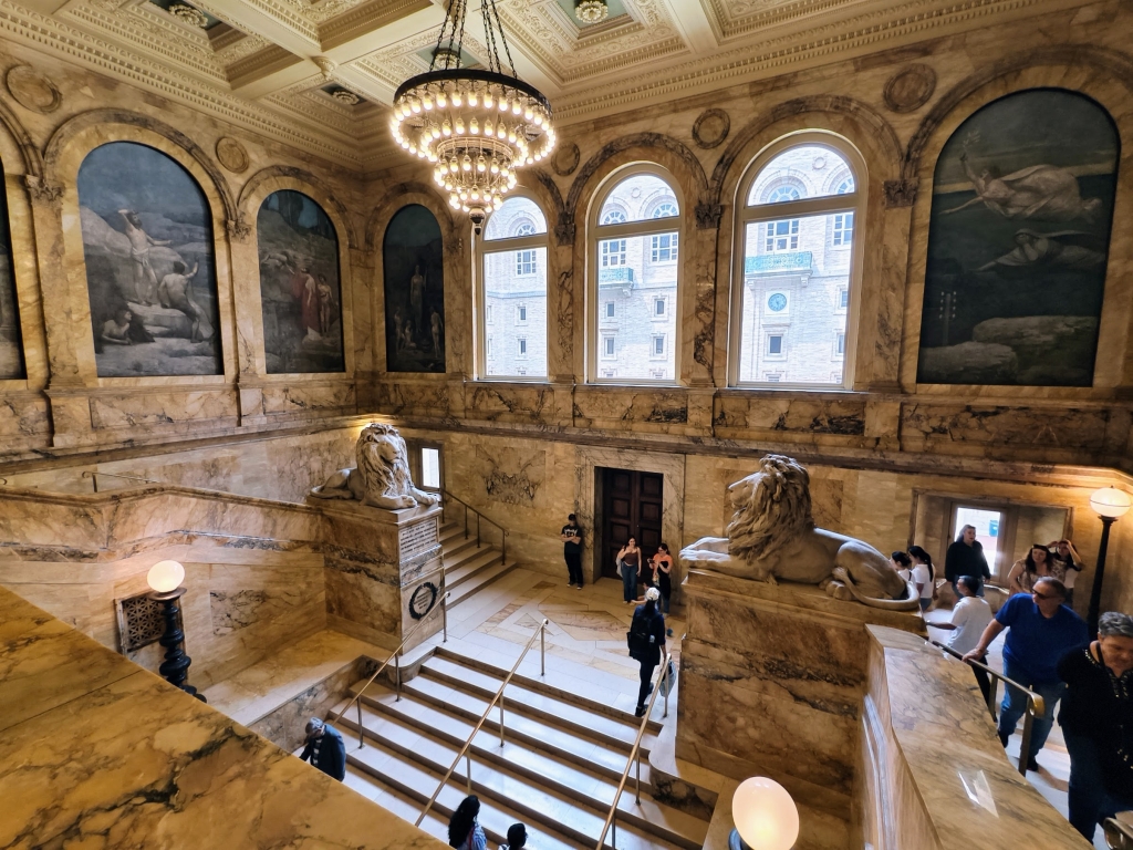 踏入麥金館,彷彿進入歐洲的古典學院建築,中央的大理石樓梯兩側,蹲坐著紀念南北戰爭陣亡士兵的石獅,牆面環繞著法國畫家夏凡納(Pierre Puvis de Chavannes)繪製的九幅壁畫,描繪哲學、文學與自然科學等研究主題。