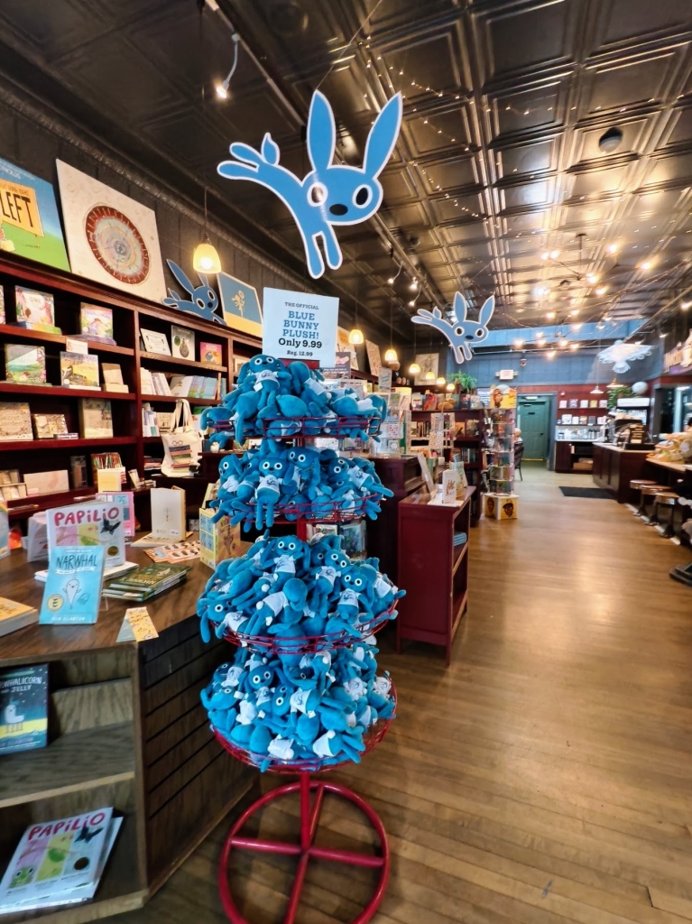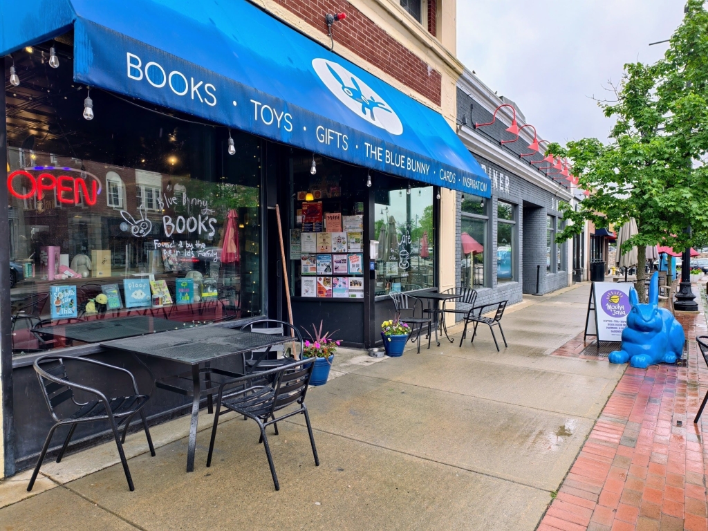 離波士頓市中心車程約半小時的戴德姆鎮(Dedham),有一家由知名繪本作家彼得・雷諾茲(Peter H. Reynolds)開的獨立書店——藍兔子書店(The Blue Bunny Books & Toys)。書店門口有一隻藍色兔子雕像,人行道上擺著戶外桌椅,一走進書店,空氣中瀰漫著咖啡香。