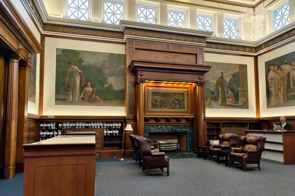 圖說:圖書館閱覽室仍保有1904 年時繪製的大型壁畫。