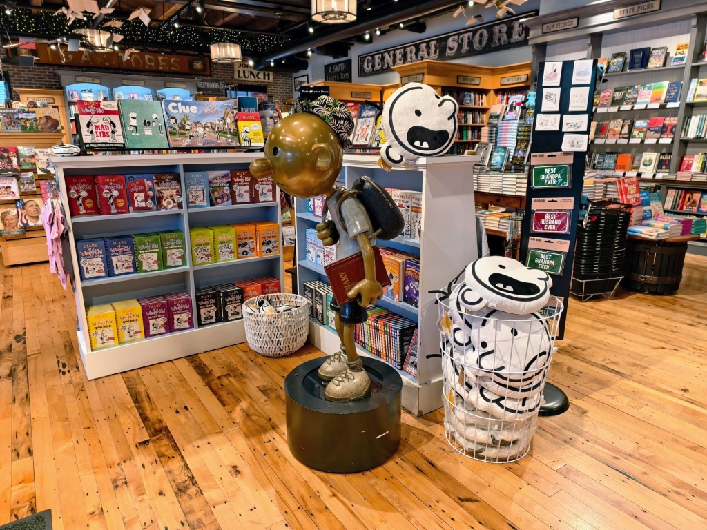 結帳櫃檯前可以看到《葛瑞的囧日記》主角的雕像,維持著書中招牌神情與略帶無奈的站姿,也有一區專門陳列肯尼的著作與周邊商品,包括親筆簽名書、角色圖案明信片、抱枕與 T 恤等,吸引小書迷收藏。