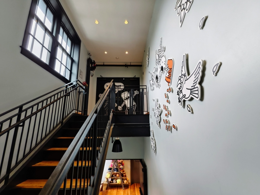 圖說:通往三樓肯尼工作室的樓梯,牆面上 裝飾著其書中角色。