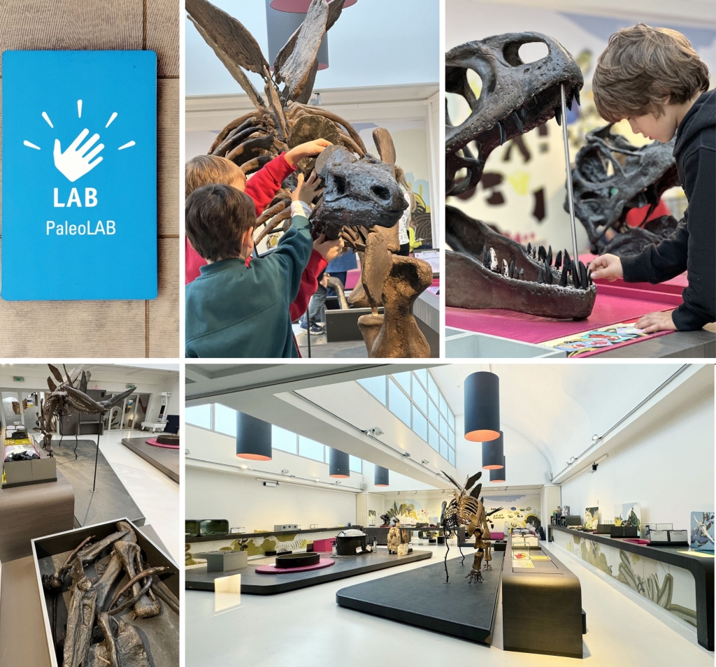除了參觀《GIANTS》展之外,Katelijne 也特別介紹了博物館內名為「PaleoLAB」的兒童互動學習區,專為 5 至 12 歲兒童設計,結合多媒體裝置與身體參與,以遊戲方式親近古生物學,透過觸摸、組裝、分類等方式,讓孩子以小小古生物學家的身份親身體驗自然科學的樂趣。觀察到孩子們在其中自然展開探索與提問的樣貌,也讓我再次確認一個設計良好的空間如何激發主動學習。回到展覽現場,我特別感謝策展人 Katelijne 的親自導覽。在事前的email往來中,我們已初步交流對兒童策展的共同關心,而她在現場更進一步分享了展覽背後的策展邏輯與細節考量,從動線設計到材質選用,每一環節都蘊含著她們團隊對兒童觀眾的理解與關注。