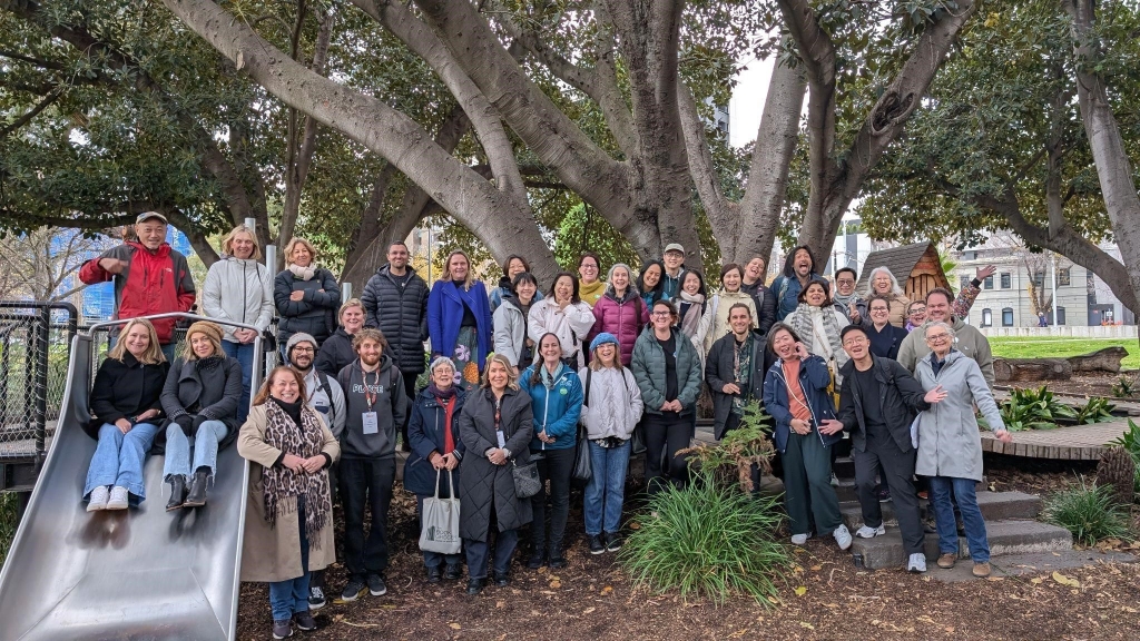 論壇前導的在地經典案例參訪行程之一:澳洲墨爾本首座公共遊戲場中的大合照(照片來源:Mary Jeavons,  Jeavons Landscape Architects創辦及負責人)