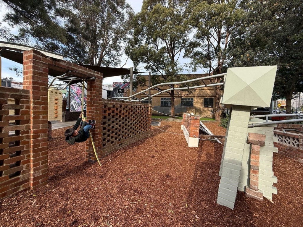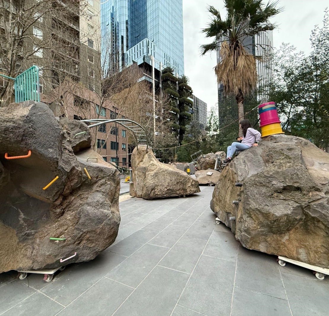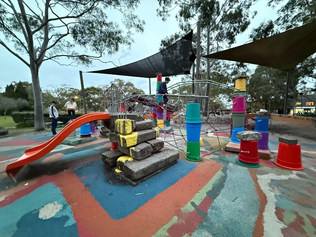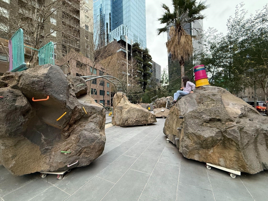 本案是墨爾本市政府近年最大規模開放空間轉型計畫一部分,融合了創客 DIY 感、藝術性和可玩性,用了超過 300 噸來自維多利亞州本地的巨大藍石,放置在家用的移動輪車上面(但小孩怎麼推都無法移動),因為這些都有麥可土木工程專業的精密承重設計。每塊巨石都嵌入扭曲的鋼筋和一些復古風格的遊具,乍看像是混亂雜物的廢棄場地,但卻是用實質設計,讓親子用行動跟整個社會討論「冒險、風險、危險和危害」議題的公共遊戲空間。