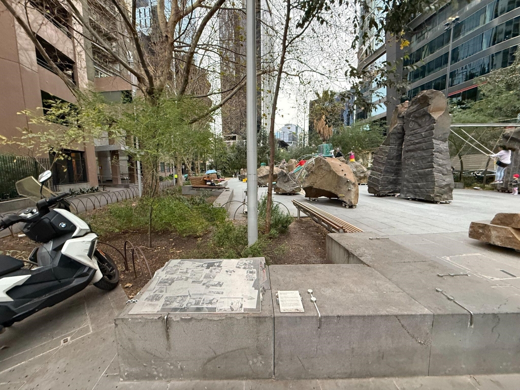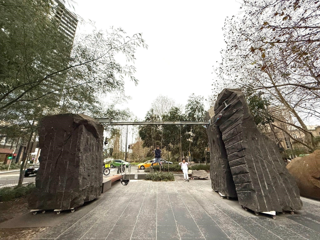 「輪子上的大石頭」是設置在澳洲原住民族 Wurrundjeri Woi-wurrung 的傳統領地上 — 麥可在作品說明牌,特別強調這一句,不僅致敬第一國族(First Nation),也讓我開始思考和前二例比較之下,一個沒有強調第一國族、一個根本沒放說明牌,有何差異?設計公共空間時,麥可是否也在回應更久遠的歷史記憶以及人對土地擁有權正義的批判?
