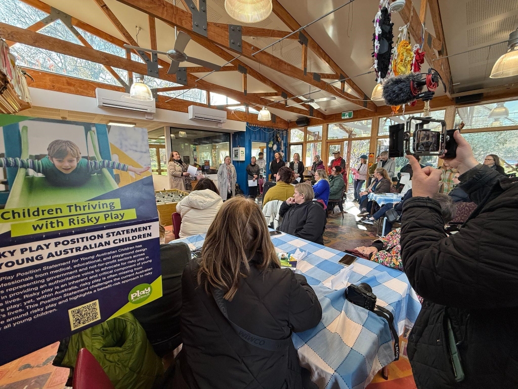 澳洲其實也有很多被叫作冒險遊戲場但其實是風險遊戲場的公園,但這就是澳洲社會的在地文化不同。如果要提到真正定義下、墨爾本自己在地的冒險遊戲場,那就是我們此行也去參訪的 The Venny(凡尼冒險遊戲場社區中心),當日現場,也進行了澳洲「全國風險遊戲立場宣言(National Risk Position Statement)」儀式,期待有更多場域、活動及專業支持,能讓各年齡層的兒童青少都能在高挑戰、高動能和高風險的遊戲過程中,獲得各種應得的身心發展健康益處。