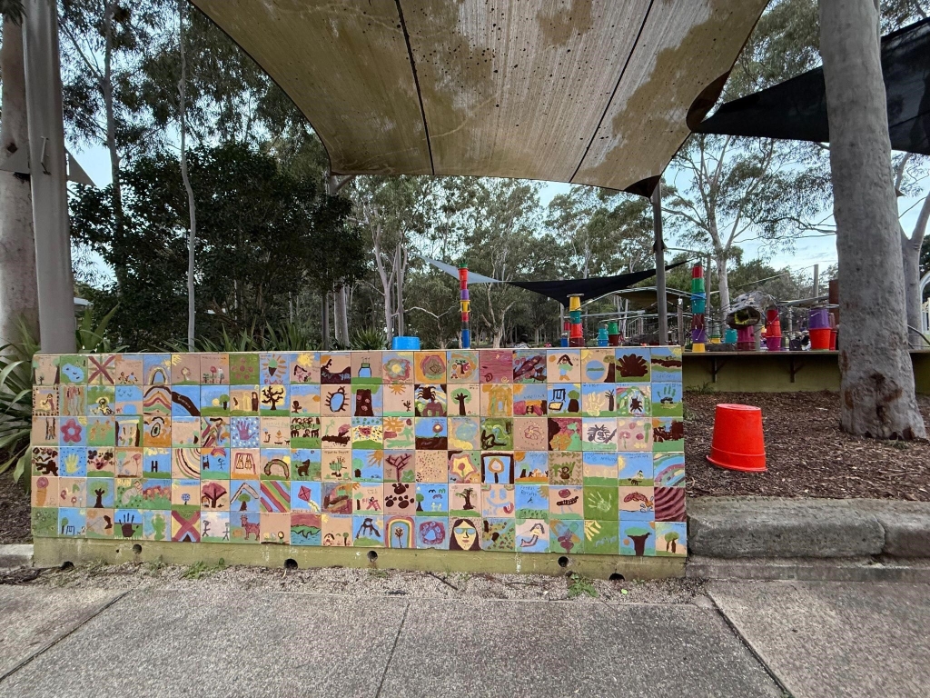 這個計畫是因為在地居民的提議,還有所有社區的親子支持之下共同完成,遊戲場玩水沙坑區的圍牆,是每一個參加的小孩的畫作,從四、五歲到十二歲都有,有的畫滿版的太陽、有的畫了甜筒冰淇淋,版面裡出現最多的就是滑梯和大樹,當然也有鞦韆和沙坑,或是畫出在玩耍的自己,每一個都用小塊磁磚拼貼出濃厚的社區手作感和兒童參與感,麥可看來想呈現一種「低成本、高創意」公共空間的共創精神。