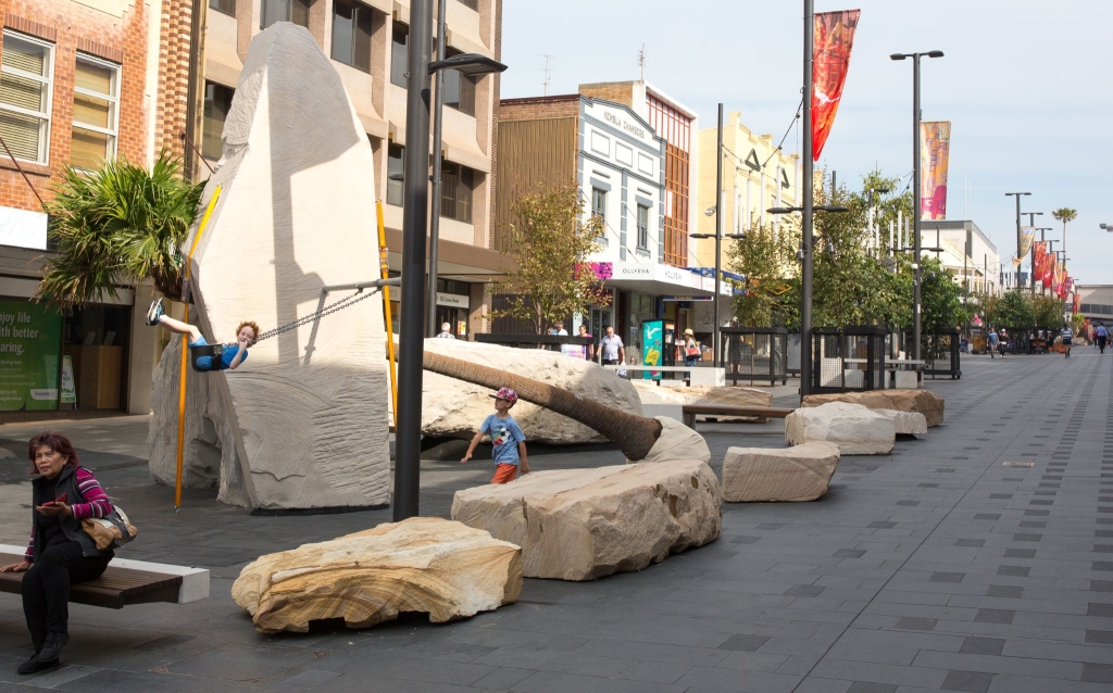 他首次在臥龍崗市製作的永久空間作品 Placed Illawarra Landscape(暫譯:被置入進臥龍崗市皇冠街購物步行廣場的伊拉瓦拉地貌景觀)就得了大獎,因為他把新南威爾斯州伊拉瓦拉這個沿海區域的自然元素放在市中心,包含一根 17 公尺高的「棕櫚柱」、棕櫚造型座椅、40 幾塊「叉車石(forklift rocks)註 3」及三座大型砂岩所客製的遊戲場,討論了自然和人工的抗衡、藝術與遊戲的融合,以及用遊戲促進地方創生(亦即遊戲創生 – playmaking)為資本主義單一樣貌的公共空間,帶來人們使用設施時展現生命力的互動對話。