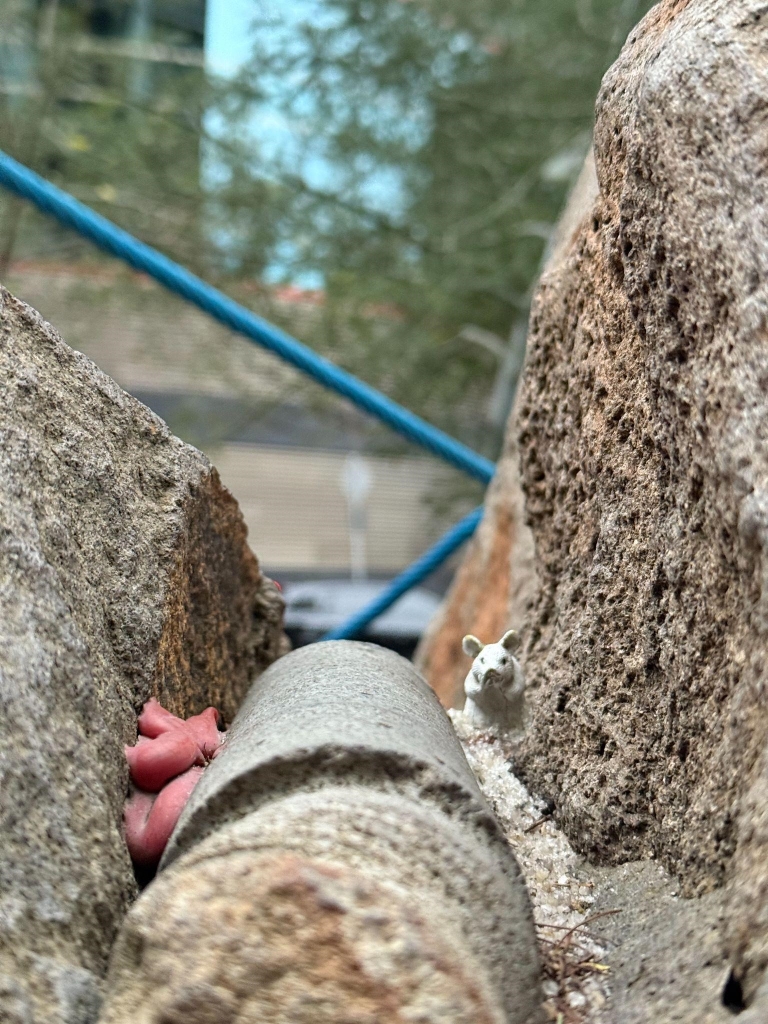 另外,因積極談論兒少在遊戲設計中獲得「自由」,和其他場域相異的是,他刻意在「輪子上的大石頭」的花圃擋邊、矮牆和座椅邊緣,刻意裝設防止滑板去刮磨側滑(grind)的防滑板金屬件,就像在台灣常見幼兒家長排斥青少一起在遊戲場玩,麥可極帶諷刺對城市挑釁:到底誰決定這個公共空間誰能玩什麼、誰又能是主要使用者的正當性。