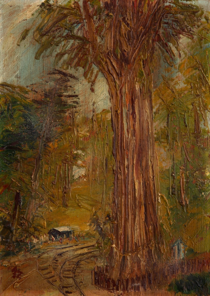 是畫家給了神木來生,曾經的永恆凝鍊為剎那,自然的輪轉與畫家的創作一齊反證了時間在某種意義上的可逆,在我看來那便是阿里山的繪畫使我領略到的第一層意義,這是人文藝術結合自然景觀,一次連綿至今、超越時空的對話。