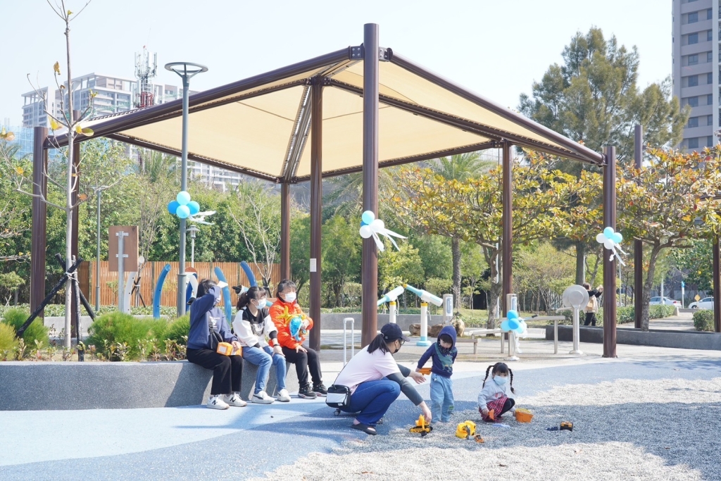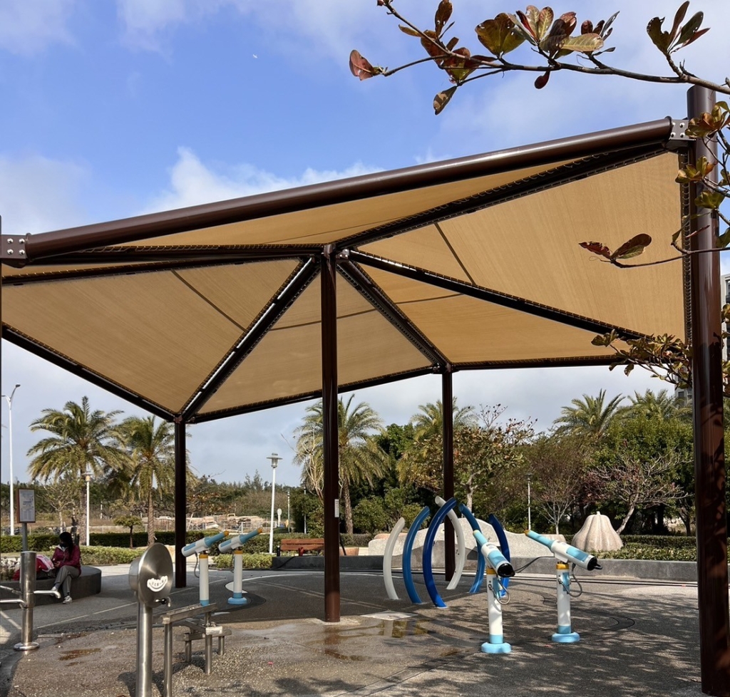 遊戲場設置自然通風的遮陽設施,並大幅增加遮陽面積,降低戶外熱傷害,讓市民在不同時段都能舒適暢玩。