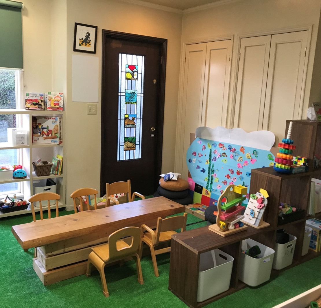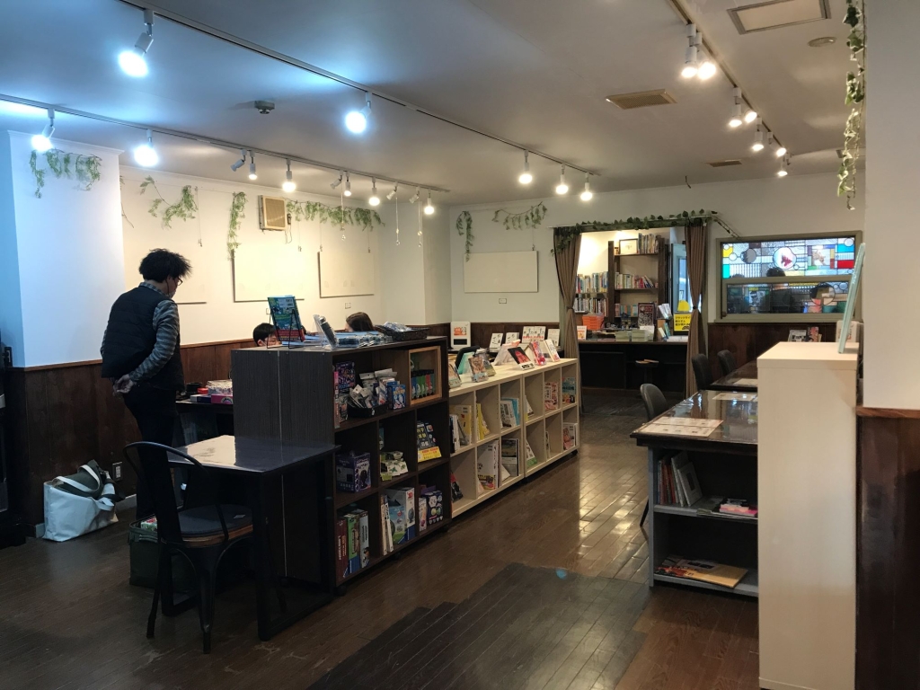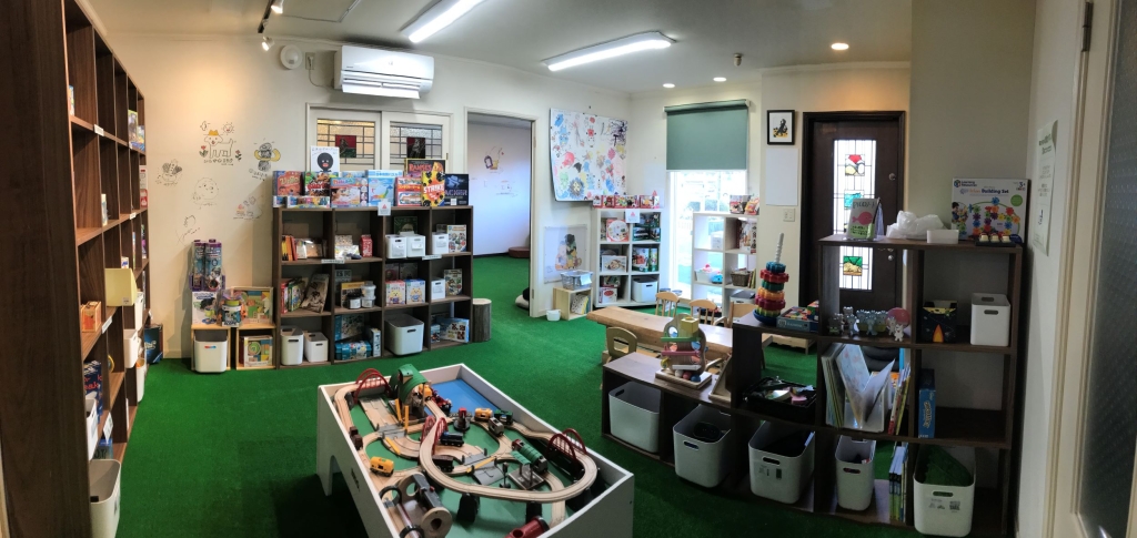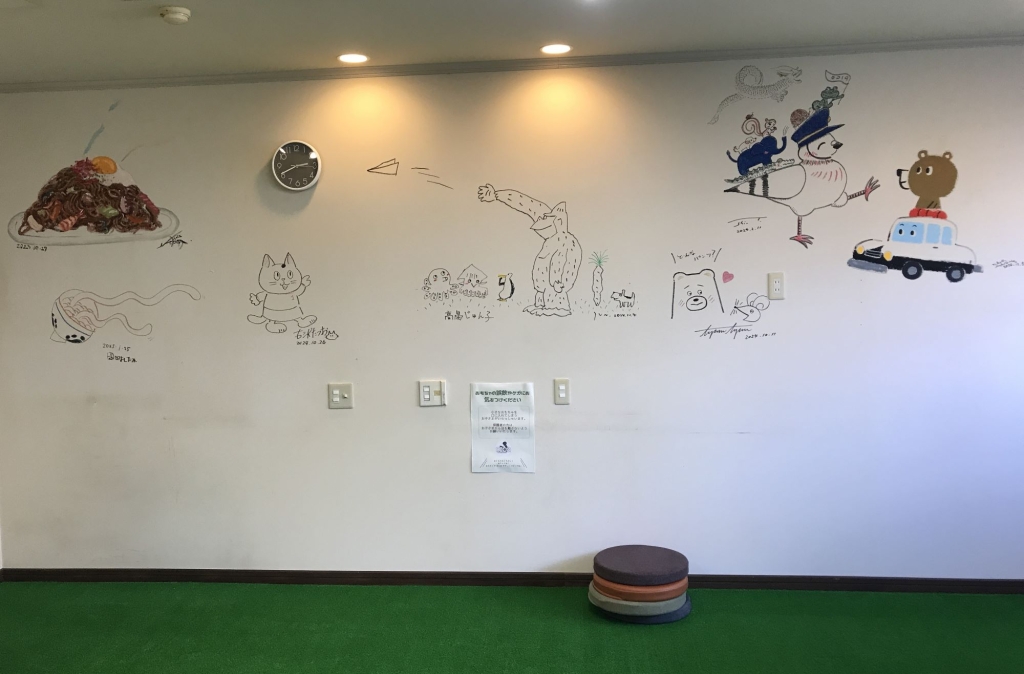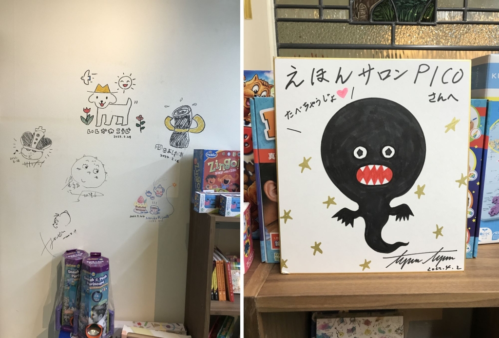 再往裡面走,就是知育玩具區,裡面有各式各樣的玩具、桌遊,也有繪本週邊玩具。我坐在那邊喝茶時,就看到好幾對像是親子的常客,感覺是幼兒園剛放學,很習慣就帶來這邊玩一陣子再回家。這個空間的牆壁上已經有不少畫家的簽名了。