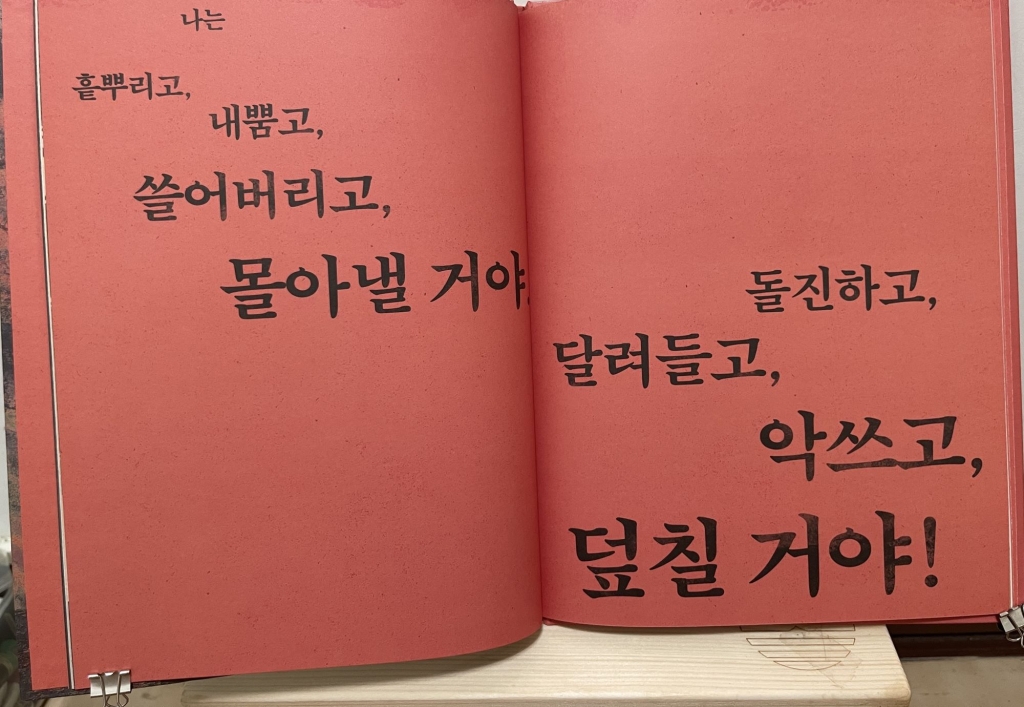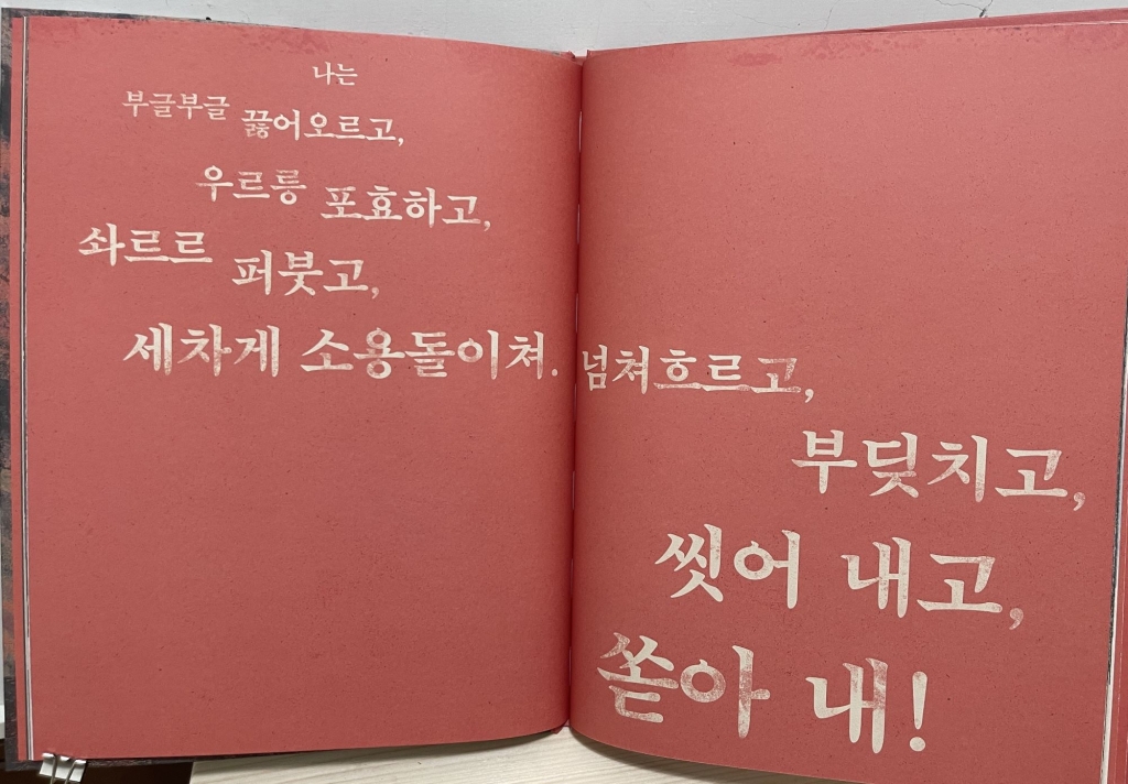 (純文字跨頁,字型較一般繪本大許多,「以字表意」、大大小小、表達「生氣」)