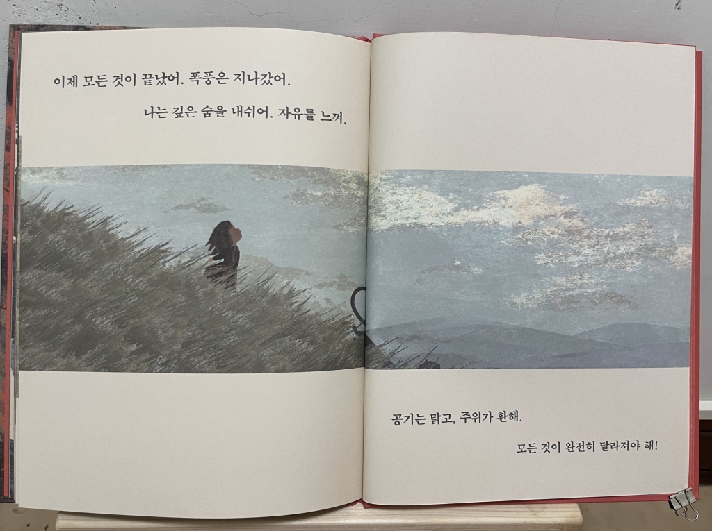 而無論再大的風暴總會平息,空氣會變得清新,就如《菲菲生氣了》(When Sophie Gets Angry-Really, Really Angry,Molly Bang)那樣,當她坐在一棵樹上,涼風吹來,她已經忘了為什麼生氣了;女孩仰望湛藍的天空,全部都風輕雲淡了,在一本短短十六頁的繪本翻頁裡「紅色」已經轉為「藍色」,此刻,全部都不一樣了!