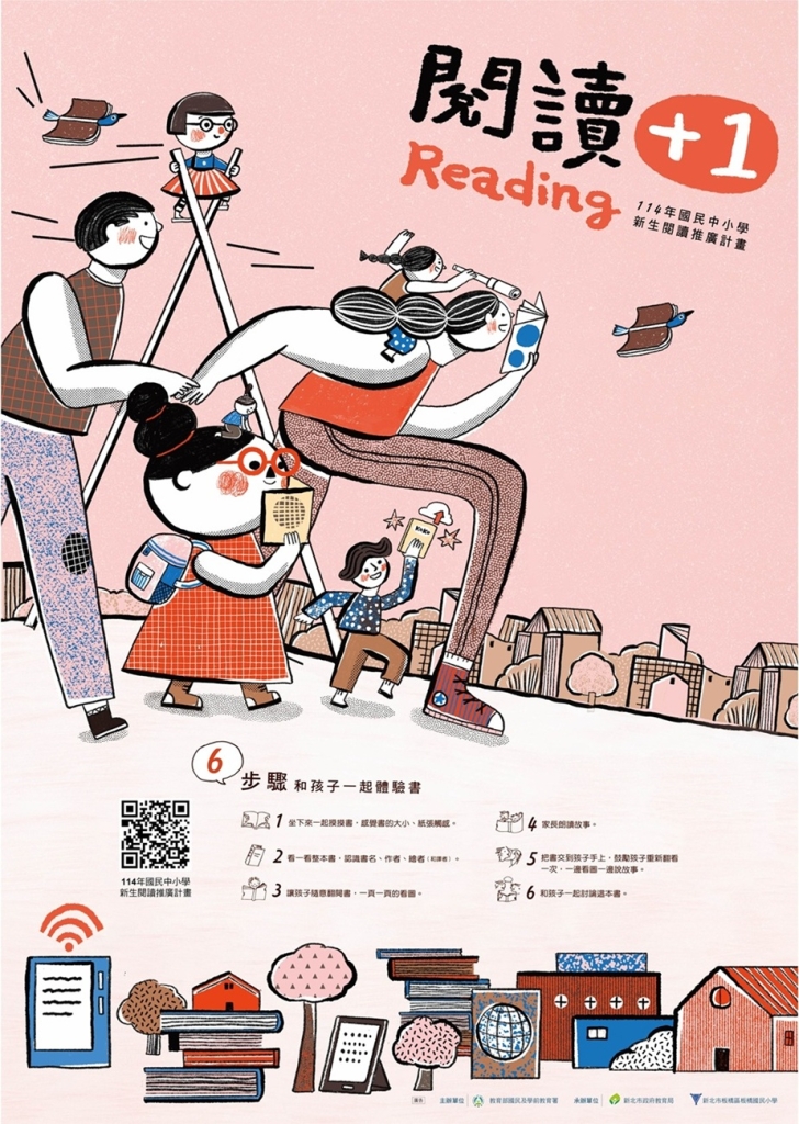 114年度新生閱讀推廣以「閱讀+1」為主題,「+1」象徵累積與成長,從第一本書開始,鼓勵學生每天多讀一點,一點點累積,讓閱讀融入日常生活,讓閱讀成為生活習慣。「+1」代表認同及參與,邀請國中小新生及家長一同加入閱讀行列,透過陪伴讓閱讀成為親子互動的契機,透過分享讓閱讀不孤單。