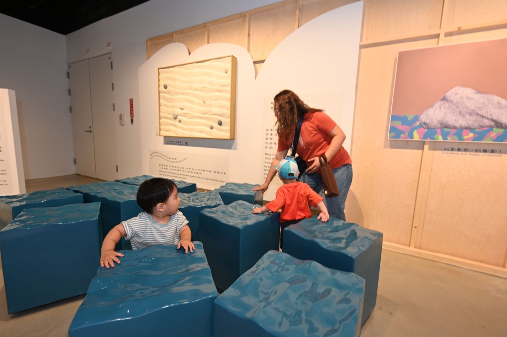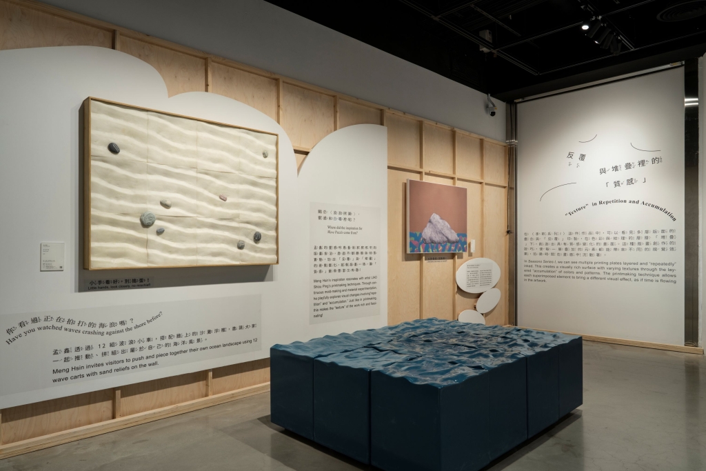 其中,石孟鑫作品〈波浪拼圖〉,透過12組波浪造形的移動模組,與廖修平老師〈季節系列I〉版畫作品對話,觀眾可親自體驗波浪小車,重新組構屬於自己的海浪樣貌。