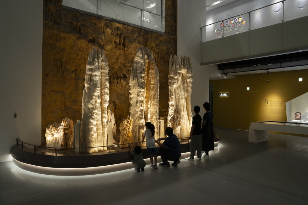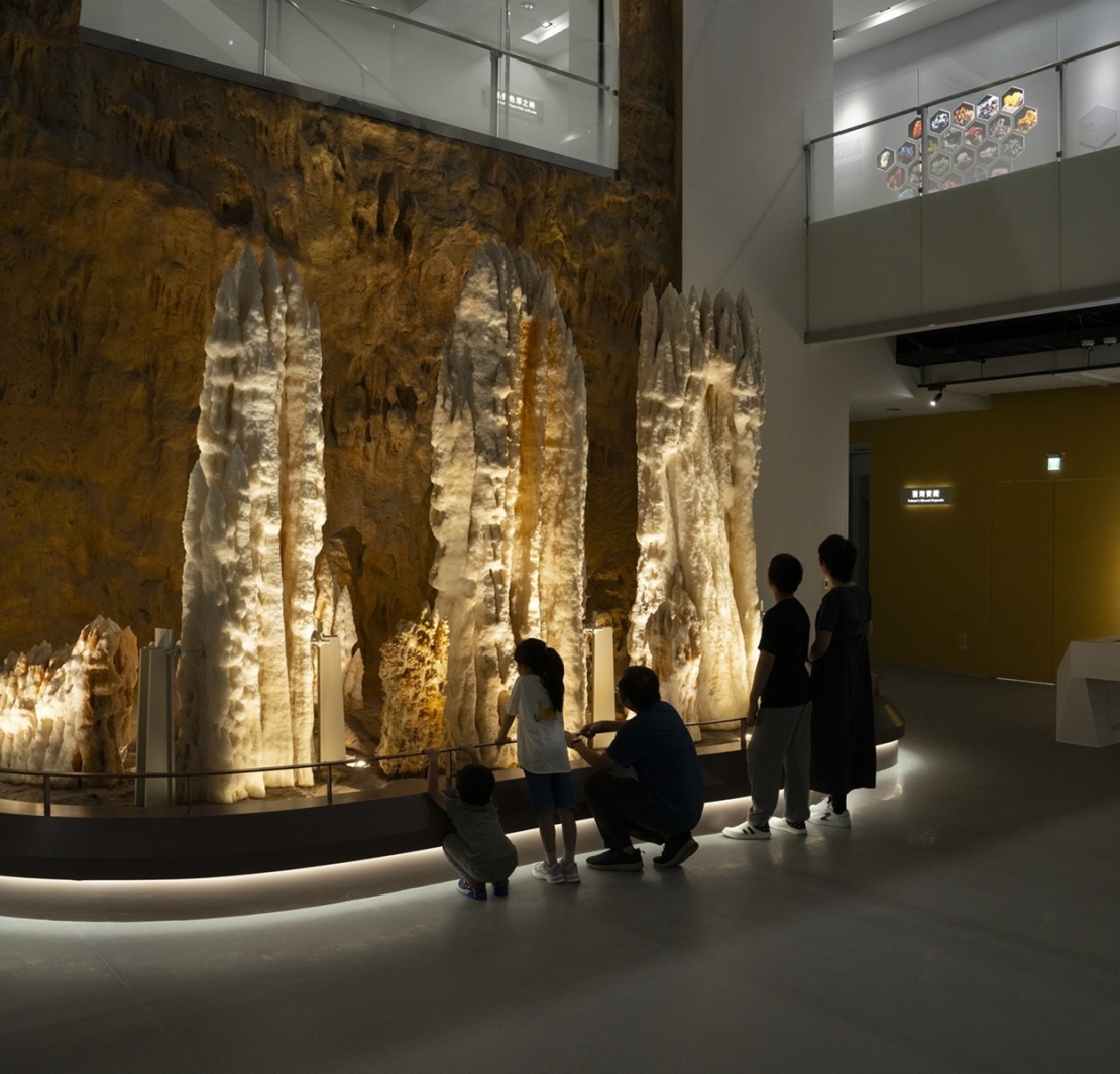 在其中的挑高區,本館典藏重達5噸、高3公尺的鐘乳石林矗立其中,相當壯觀,也塑造鐘乳石原生的洞穴景觀,得以理解鐘乳石生長脈絡,是本次亮點展品之一,期盼引導觀眾能逐步深入兼具知識性與美感的礦物國度。