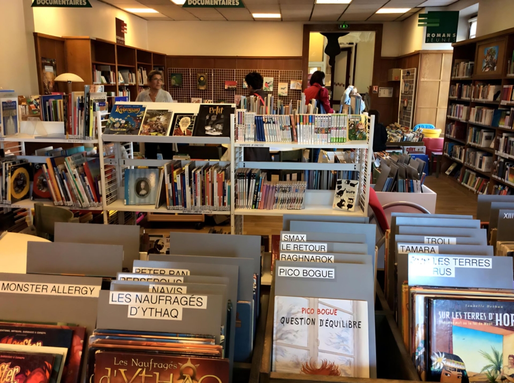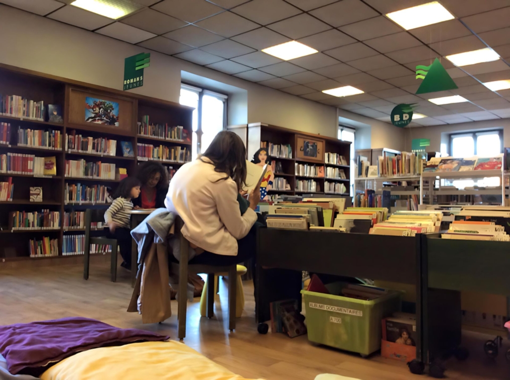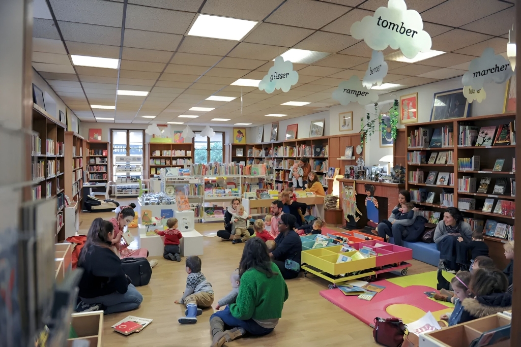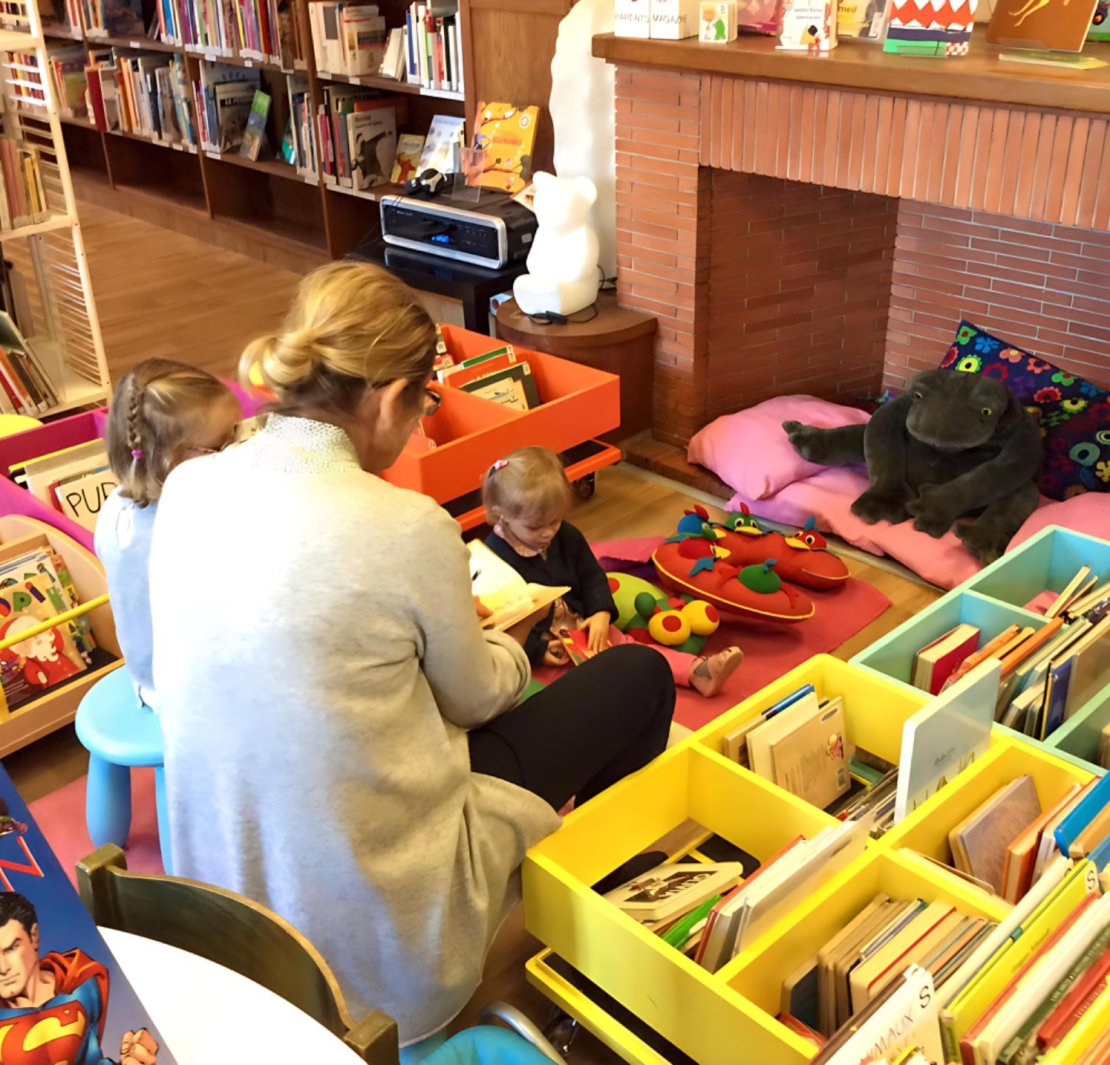 這塊區域於每週三下午機動調配,舉辦故事會活動(séances de lecture de contes)— 說故事給孩子們聽。小讀者們或窩在父母懷抱,或放鬆地躺在地板上,乘著一則則故事飛毯遨遊。