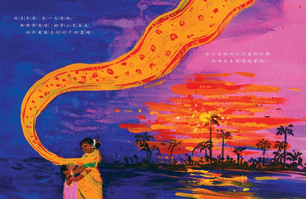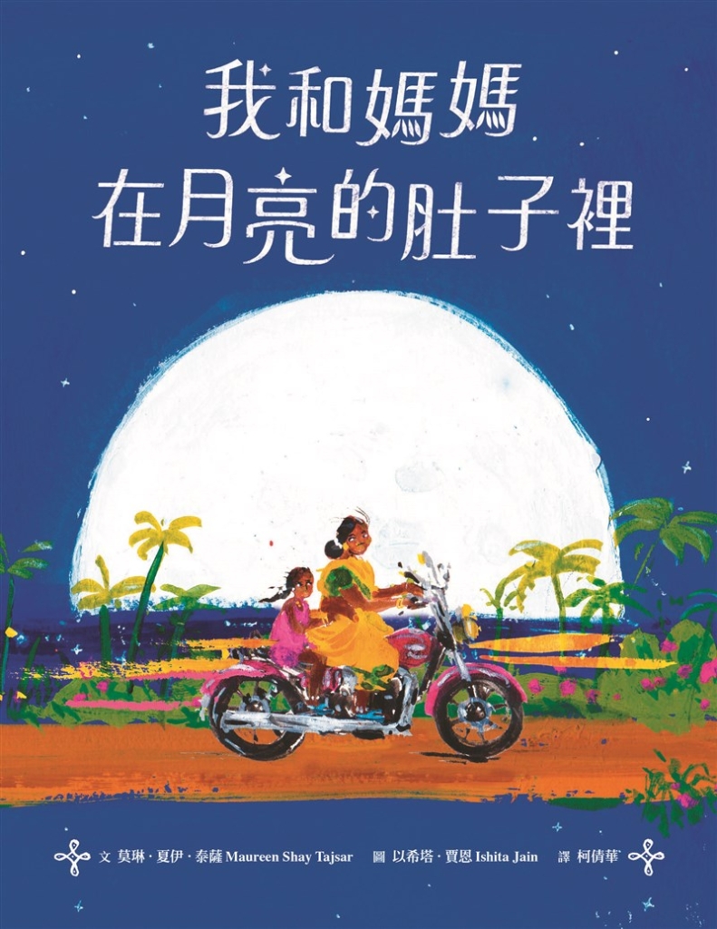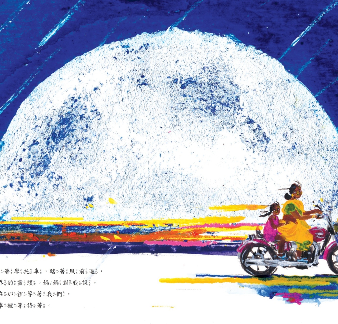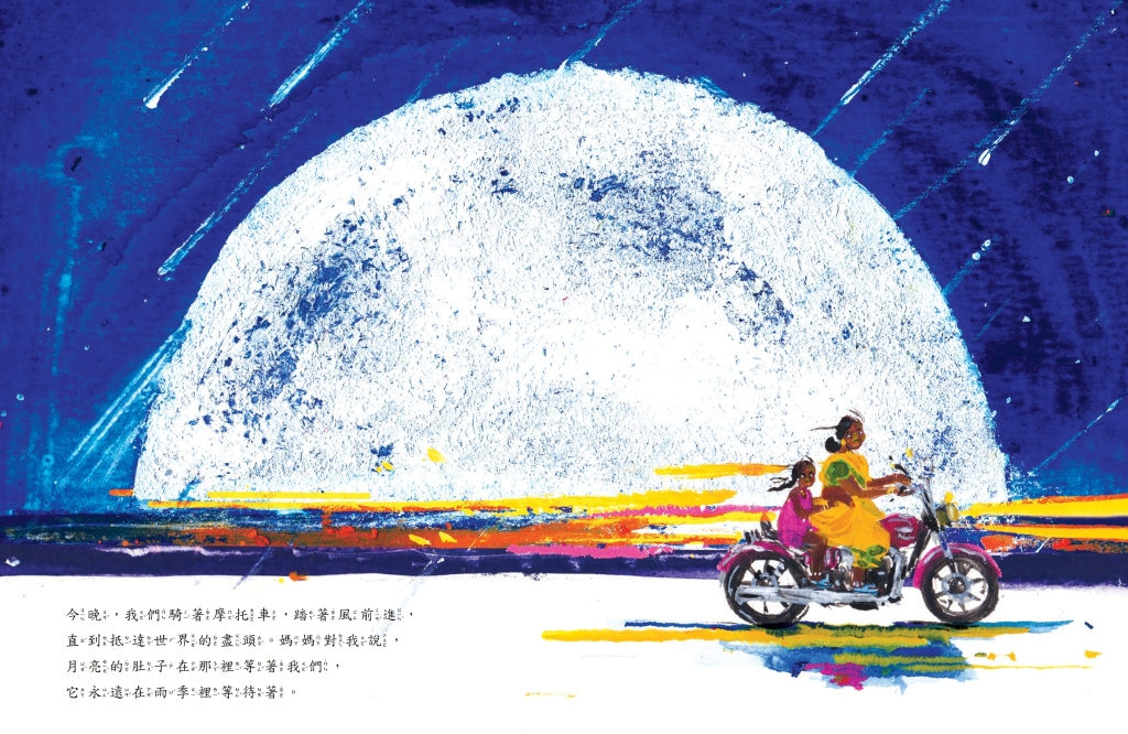《我和媽媽在月亮的肚子裡》(水滴文化)描繪在印度的溫馨故事。女孩坐在母親的摩托車上,在月夜裡行駛,經過樹林、紅土峽谷,還有藍藍的大海,故事及畫面以母親黃澄澄的紗麗劃向天際,包圍住女孩還有隨夜晚籠罩的夜;母親載著她,以車燈照亮的為方向,她們用皮膚感受炎熱、用聽覺感受青蛙嘓嘓聲、用嗅覺發現香料茶、用視覺發現九重葛裡的蛇……。