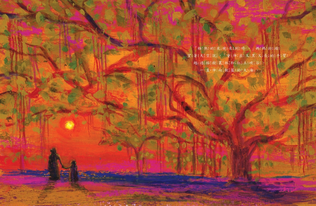閱讀這個故事時,讓我想起《猜猜我有多愛你》,畫風或故事線截然不同,相同的是那充滿想像、天馬行空,還有流動的——愛。融合了更多的異國風情,包括了顏色、聲音和氣味,結合在一起的五彩繽紛,都差點忘了這個故事是發生在靜謐的黑夜。