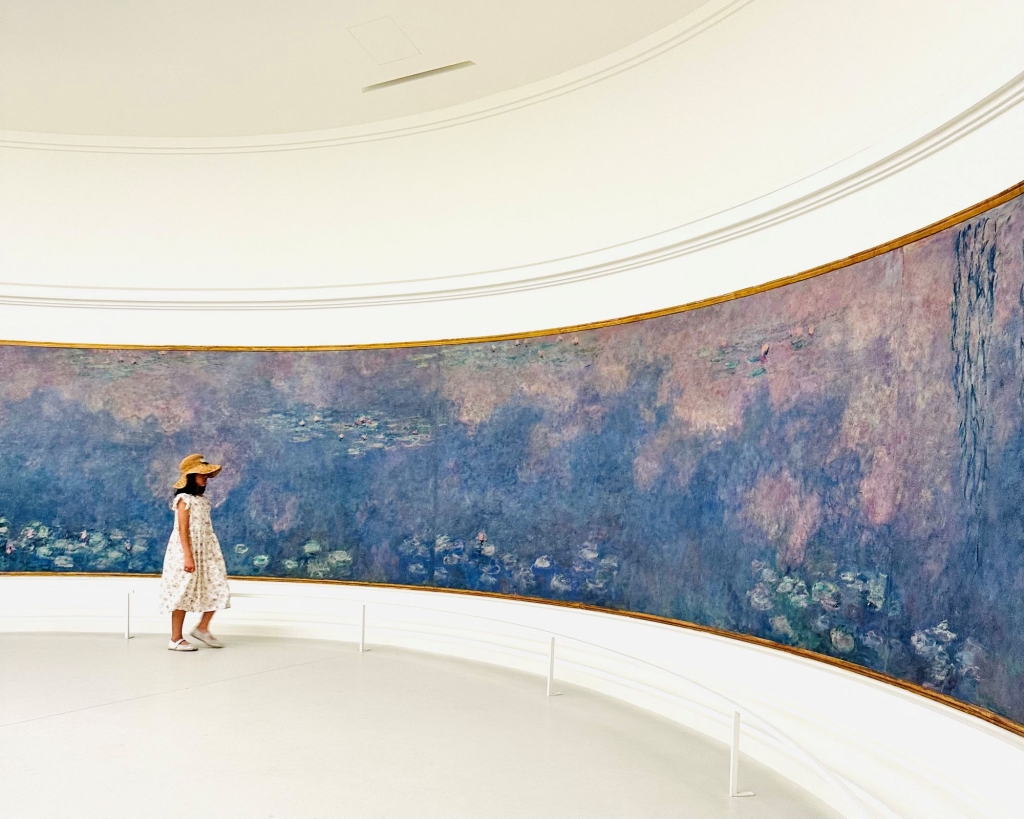 接著我們再把目光轉向奧塞旁的橘園美術館,這間美術館以八幅莫內那長達數米,可環繞空間的巨幅睡蓮聞名。印象派名稱正是來自莫內的《日出.印象》,但他1890年定居吉維尼後便開始全心投入睡蓮創作,尺寸越來越大,畫面也趨向抽象。莫內將過往印象派中,捕捉生活中當下光影瞬間推到極致,光與色被拉長,抽離時間,昇華為一種可以進入的永恆。
