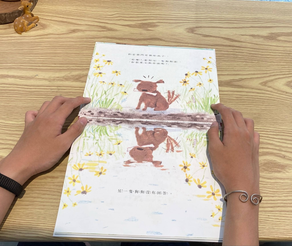 福斯多的故事讓我常常在思考,擁有了一切的就真的會快樂嗎?為什麼有些人看起來已經很富有了,卻還是覺得不滿足?我在《更棒的骨頭》找到了答案,作者在前言寫道:「《更棒的骨頭》改編自伊索寓言《貪心的狗》,不過賽門的結局比較快樂(因為他是個好孩子嘛)」讀了賽門的故事再看到這段話我會心一笑,書裡這隻狗狗賽門得到了一根很棒的骨頭,卻在經過池塘時發現水裡有隻狗嘴裡也叼著骨頭,那根骨頭看起來比他的更棒,他用了很多方法想說服水裡的狗狗和他交換骨頭,最後不小心,骨頭和賽門都掉進水裡,等賽門游回池邊,他發現自己和水裡的狗都沒了骨頭,故事到這裡,伊索寓言已經在告示我們別和狗狗一樣貪心,但賽門的故事還沒有結束,在他思考著要怎麼跟水裡的狗說對不起時,他發現了一根更大的骨頭!他叼起骨頭毫不猶豫的丟進水裡,送給了那隻「水裡的狗狗」,他開心的打滾,失去了骨頭,他得到了朋友!看到這裡我想每個人都會跟著一起微笑,賽門果然是個好孩子,他值得這樣比骨頭更棒的快樂!