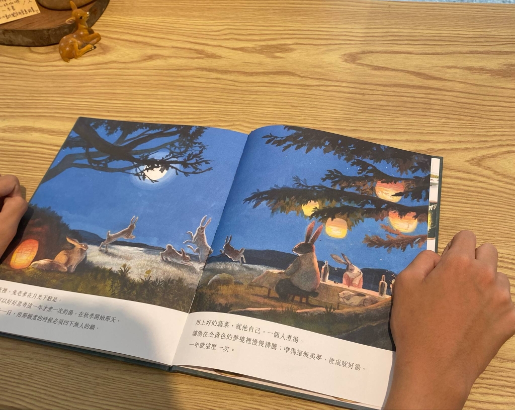 讀了這些書,你也和我一樣慢慢發現這些藏在書頁裡,可以讓心富足的故事秘方了嗎?讓心變得溫暖又富足,不一定要擁有滿滿的財富,也不用賣力的比拼搶奪,就像《兔老爹魔法湯》最會煮湯的兔老爹,他能烹煮出全世界最好喝的湯,受到無數的讚美和肯定,這樣魔法一般美味的湯卻在他開始大量生產銷售到世界各地後,失去了最初迷人的風味,兔老爹關閉了工廠宣告退休,他在月光下好好思考,一年只煮一次的湯,必須要用最好的蔬菜,獨自熬煮,讓湯在他金黃色的夢境裡慢慢沸騰。「唯獨這般美夢,能成就好湯。」兔老爹最後終於發現了讓湯成為魔法的秘方,那個金黃色的夢境,曾經被盛名和虛榮遮掩,讓他忘記了最初懷抱怎樣的心情煮湯,但願這書裡的月光照映下,時刻提醒兔老爹和我們都能不忘初衷。