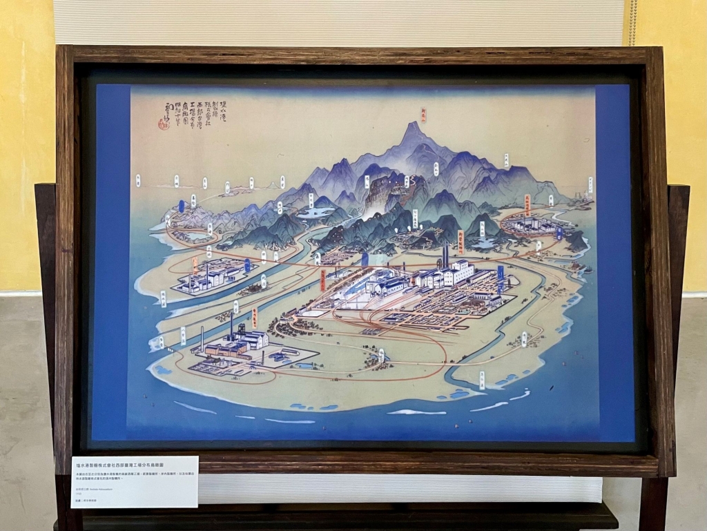 此外,本次特展最後的展間,也展出日本「堺市博物館」授權、由吉田初三郎繪製的〈塩水港製糖株式會社西部臺灣工廠分布鳥瞰圖〉,此圖以塩水港製糖為主題繪製,並完整記錄原屬林本源製糖株式會社的製糖所,屬於不可多得的珍貴史料。