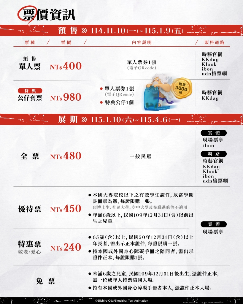 展覽內容集結眾多精彩篇章,從「航海王電視動畫25週年區」、「和之國篇區」、「蛋頭島篇區」到「新四皇區」共分為四大主題,帶領著觀眾重溫動畫經典。展區內更細分出十一大亮點內容,內容不僅豐富多彩,更能從各個不同視角探索「航海王」電視動畫的魅力。即日起,特別推出「預售單人票」400元(原價480元)、「預售特典公仔套票」980元(限量3,000組),於時藝官網、kkday等通路正式開賣!