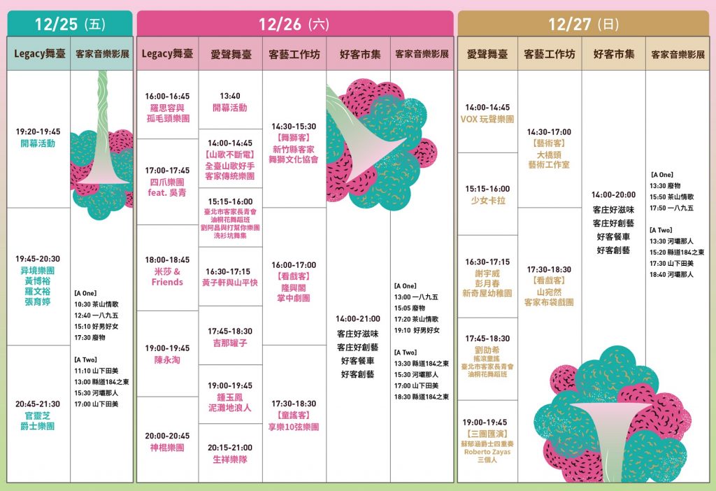 一連三天的客家音樂盛會,邀請共18組客家音樂人,分為「Legacy舞臺」及「愛聲舞臺」。