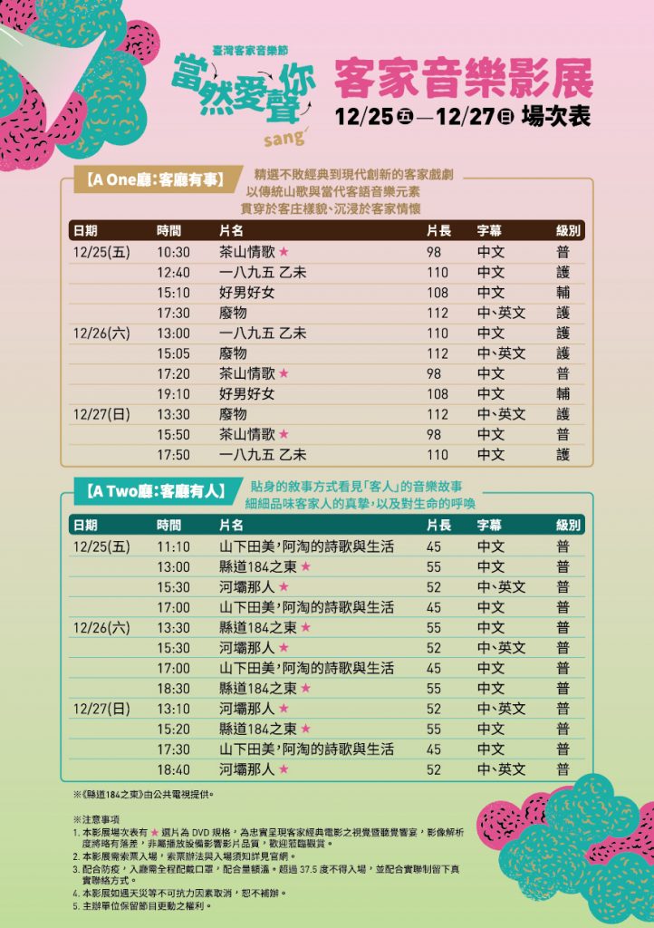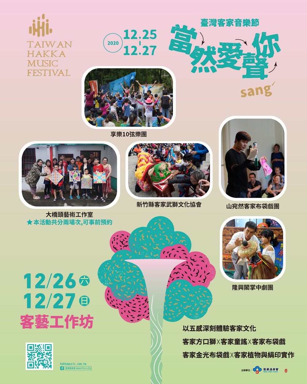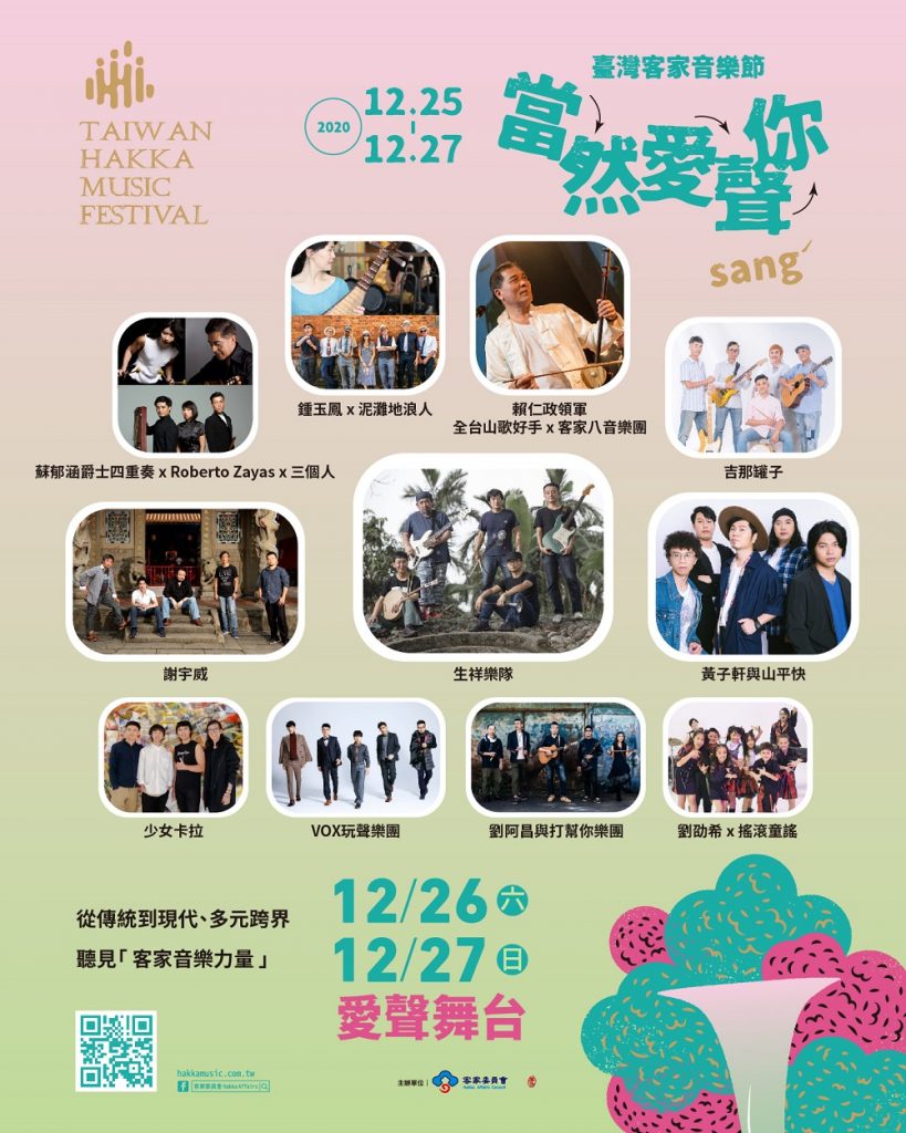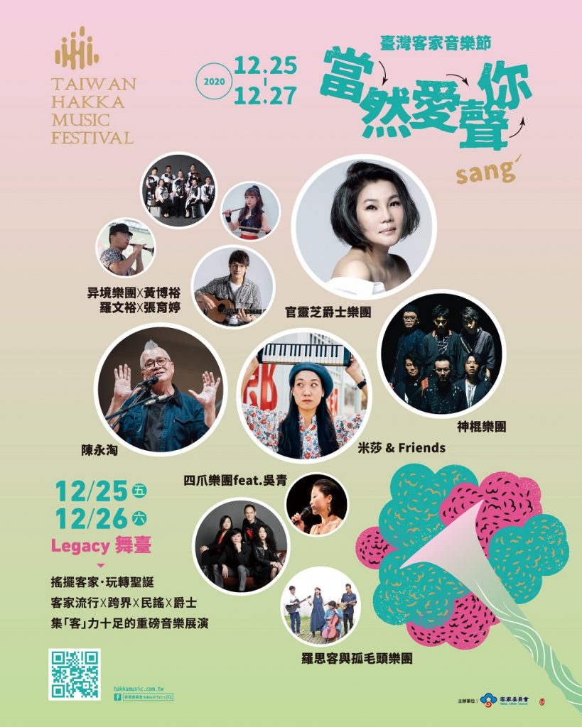 其中12月25日至12月27日於華山1914文創園區北側綠地、永豐Legacy Taipei及光點華山電影院盛大舉辦的「臺灣客家音樂節-當然愛聲你」主體活動,不只有兩大音樂舞臺演出,更首次結合客庄特色市集、客藝工作坊及客家音樂影展等多元內容,囊括流行、跨界、搖滾、民謠、古典、爵士、藍調等音樂演出,連續三天帶領民眾過不一樣的聖誕假期!